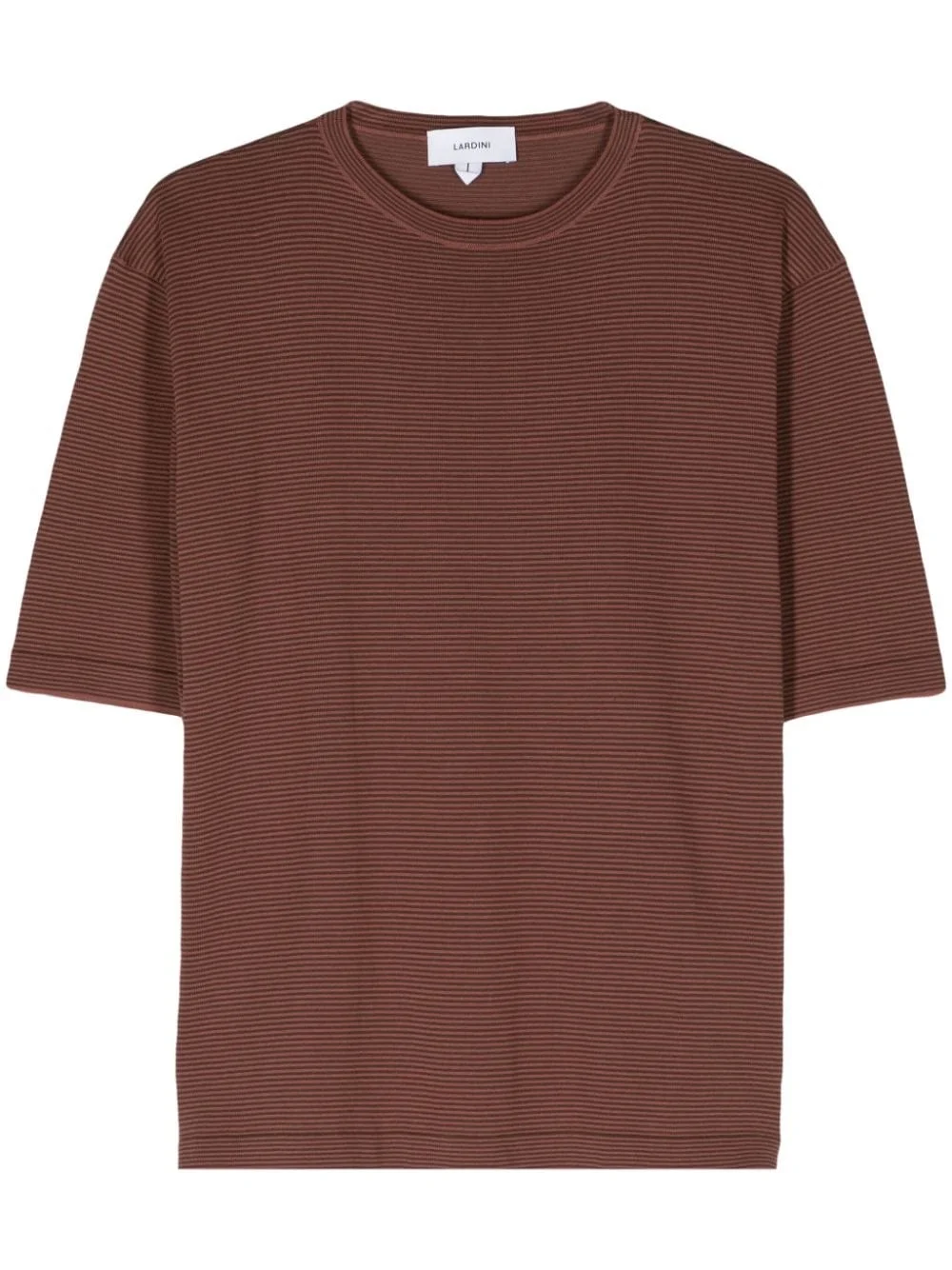 striped knitted T-shirt Highlights - Auburn brown/burnt orange - Cotton - Knitted construction - Fine knit - Horizontal stripe pattern - Crew neck - Drop shoulder - Short sleeves - Short side slits - Straight hem Made in Italy Composition Cotton 100% SIZE & FIT FittingInformation Designed to be unstructured, offering a loose fit throughout Made from a midweight non-stretch fabric, this piece offers minimal elasticity when worn