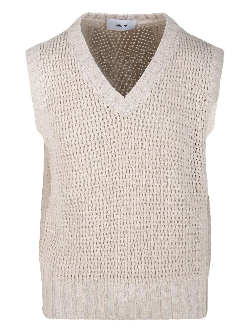 V-neck open-knit sweater Highlights - Ecru - V-neck - Open knit - Sleeveless - Ribbed hem Made in Italy Composition Cotton 74%, Polyamide 26% Washing instructions Read Manufacturer Guidelines