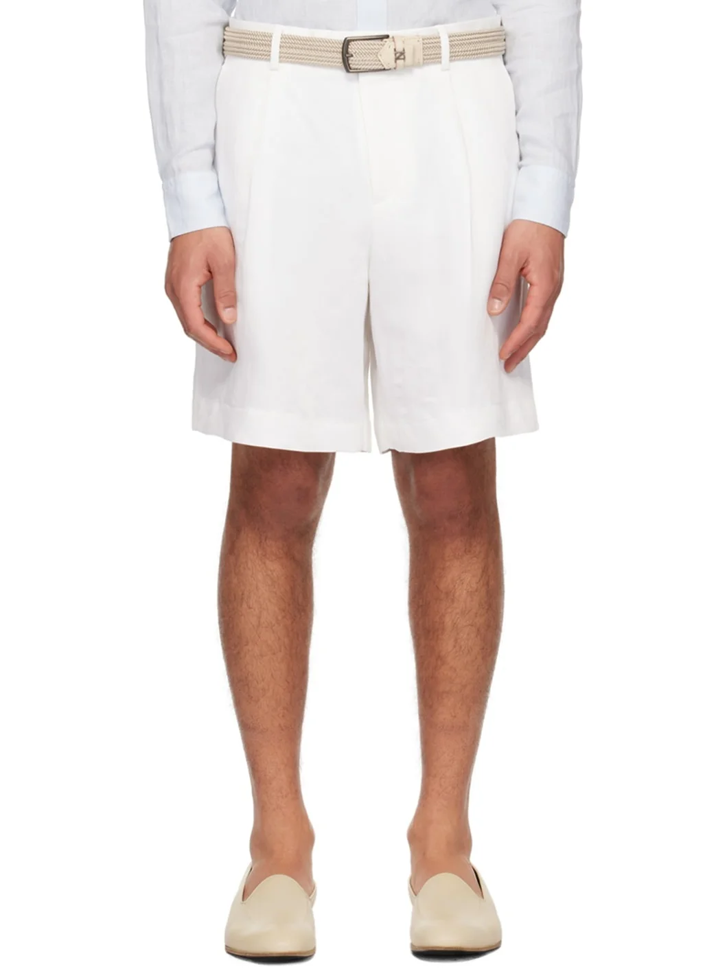 Plain-woven slub linen-blend shorts. · Belt loops · Four-pocket styling · Zip-fly · Pleats at front Supplier color: White 61% linen, 39% tencel. Made in Italy 241125M193001