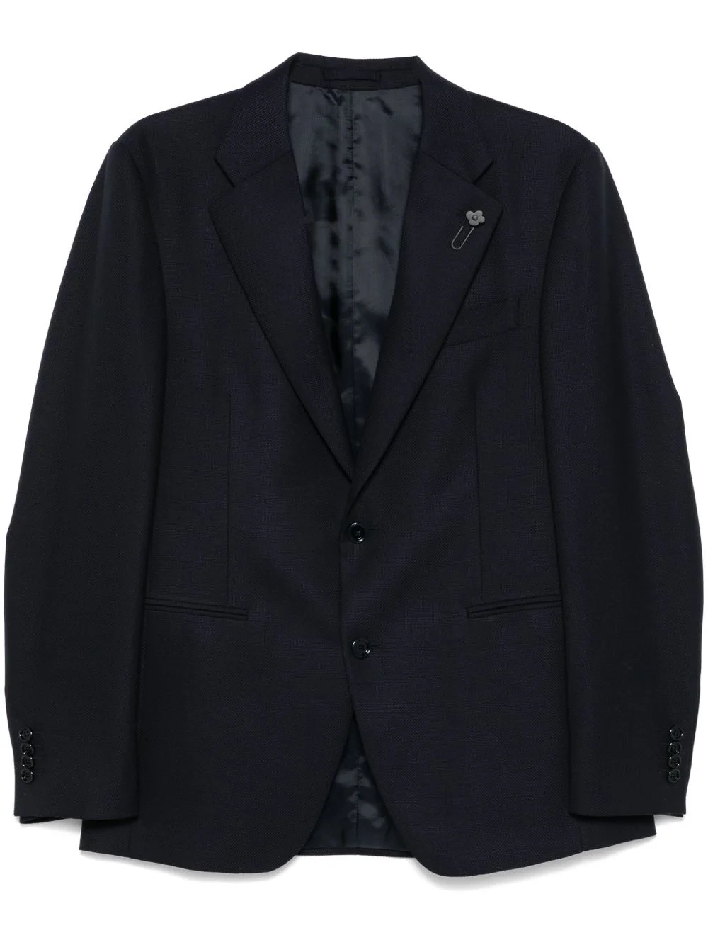 wool blazer Highlights - Navy blue - Wool - Interwoven design - Front button fastening - Notched lapels - Logo brooch detail - Long sleeves - Buttoned cuffs - Chest welt pocket - Dart detailing - Two side jetted pockets - English rear vents - Multiple internal slip pockets - Full lining - Straight hem Made in Italy Composition Outer: Wool 100% Lining: Viscose 52%, Cupro 48% SIZE & FIT Model measurements Height 6 ft 1 in(1.85 m) Bust/Chest 35.82 in(91 cm) Hips 37.79 in(96 cm) Waist 29.13 in(74 cm) FittingInformation Designed for a slim fit, offering a comfortable fit that sits just away from the body The vented hem offers movement at the rear Made from a midweight non-stretch fabric