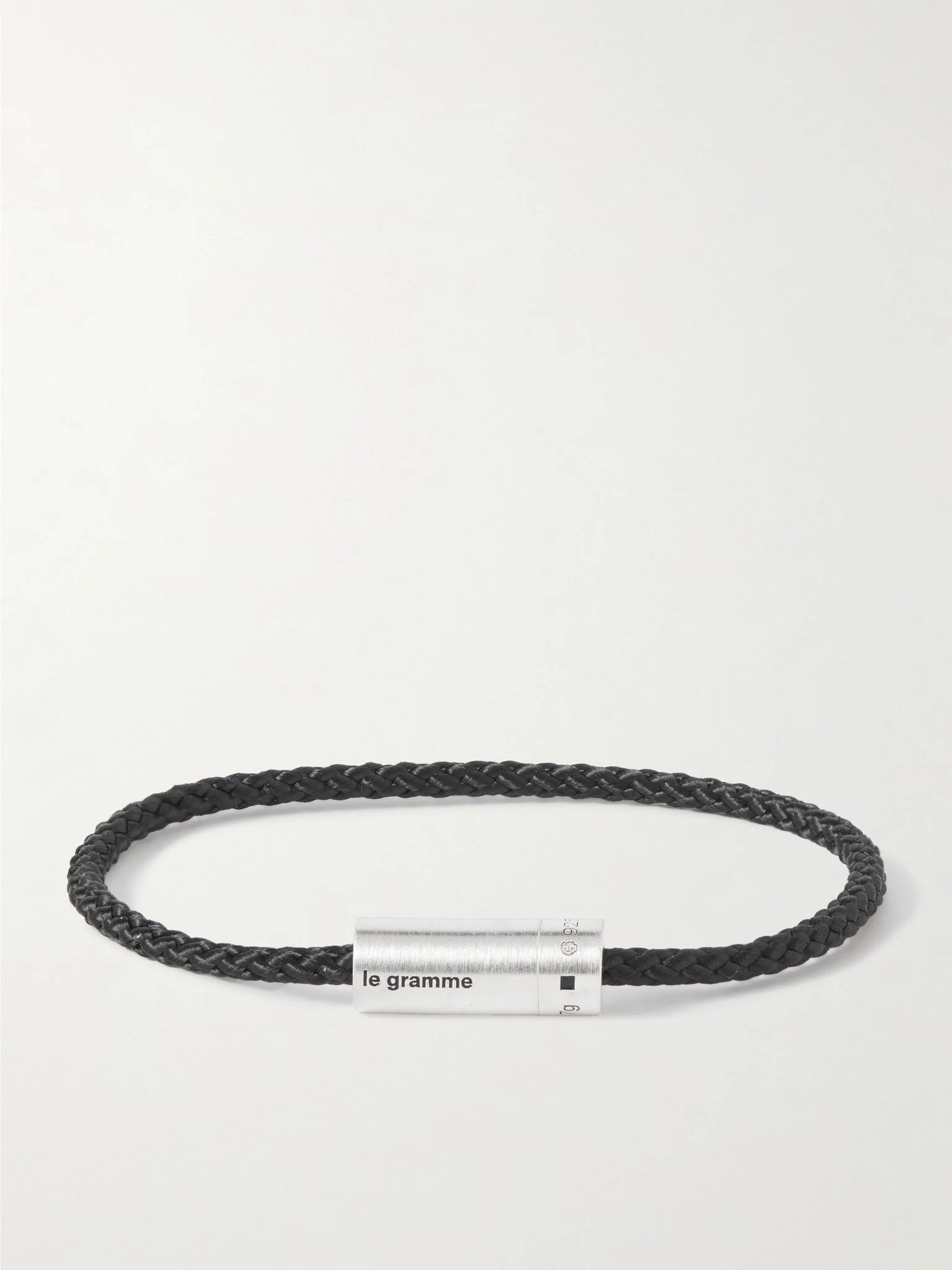 Le Gramme takes its cues from industrial design, so its jewellery is always clean and minimal. This '7g' braided cord bracelet is centred with a sterling silver screw-clasp that's engraved with the brand's name. Details & Care - Black cord, sterling silver - Screw fastening - Comes in a presentation box - This piece is made using precious materials and therefore should be treated with care. Surface scratches and marks are normal through wear and time, but please store items separately and clean regularly to ensure top condition - This piece has been certified in accordance with the Hallmarking Act 1973