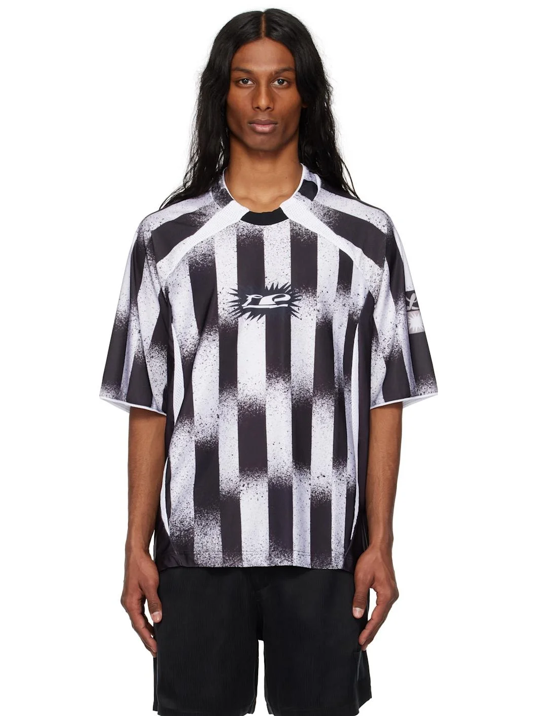 Stretch polyester interlock jersey top. Stripes and mesh trim throughout. · Rib-knit trim at crewneck · Logo graphic printed at chest and sleeve · Droptail hem · Raglan sleeves Part of the Le PERE x Antonio Carrau collaboration. Supplier color: Black 80% polyester, 20% elastane. Made in Portugal 251215M213001