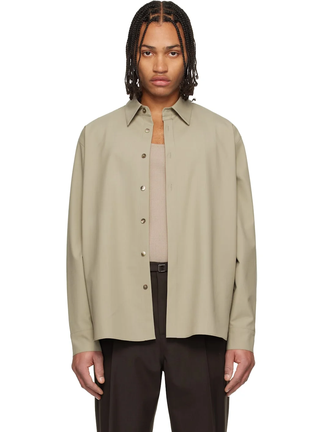 Wool-blend delaine shirt. · Spread collar · Button closure · Shirttail hem · Buttoned barrel cuffs · Logo hardware at back collar · Box pleat at back yoke Supplier color: Beige 50% wool, 50% polyester. Made in South Korea 261495M192007