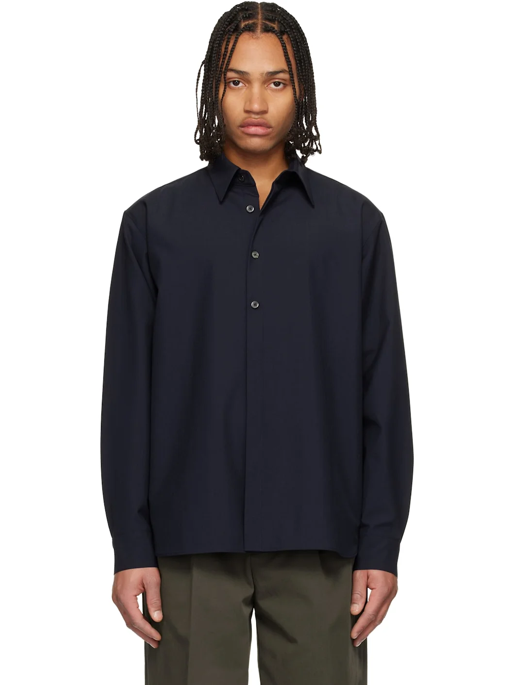 Wool-blend delaine shirt. · Spread collar · Button closure · Shirttail hem · Buttoned barrel cuffs · Logo hardware at back collar · Box pleat at back yoke Supplier color: Navy 50% wool, 50% polyester. Made in South Korea 261495M192008