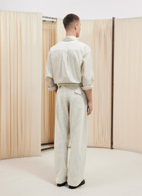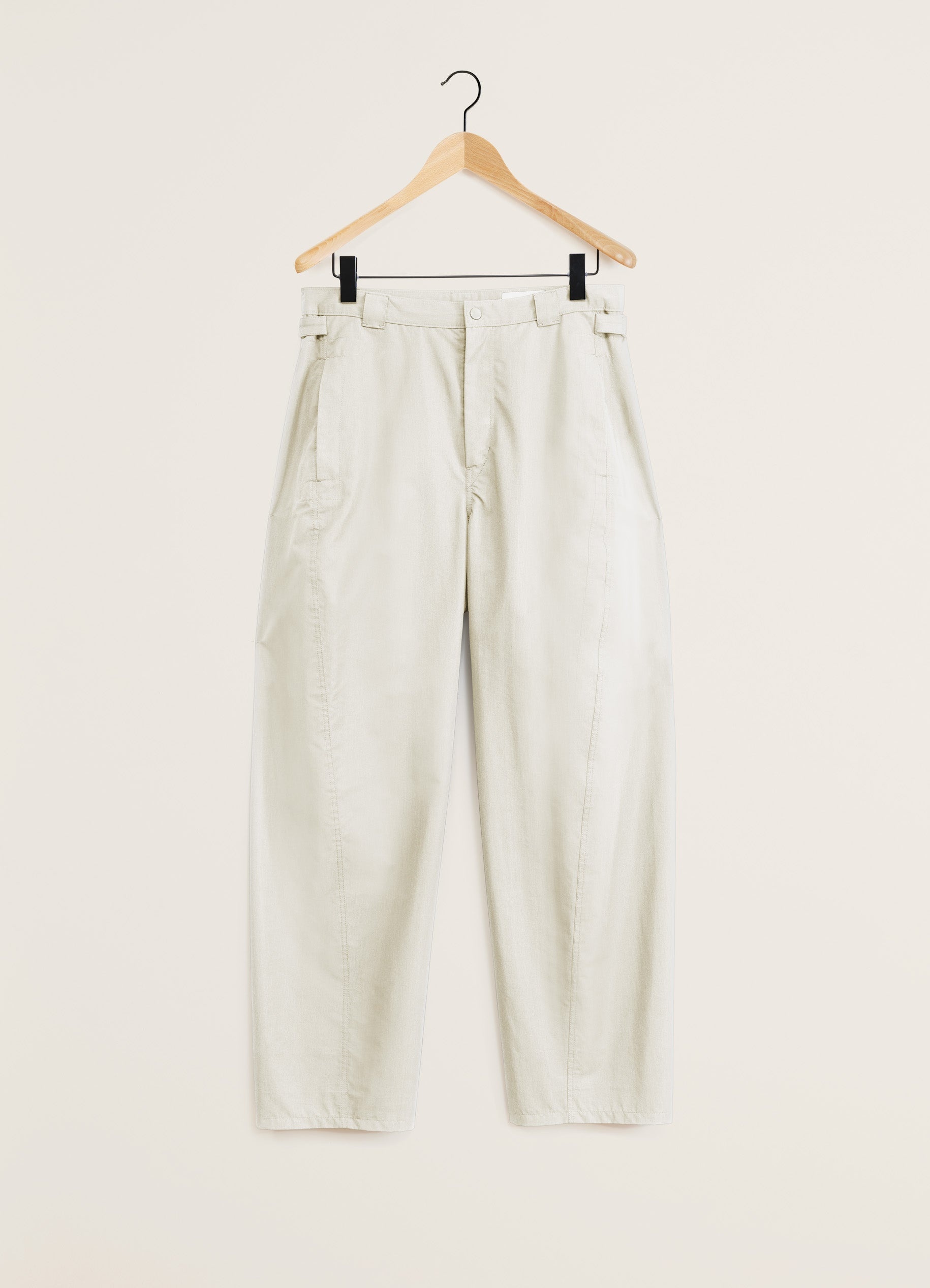 These pants are a new addition to LEMAIRE’s wardrobe. They are made in a supple cotton gabardine with a soft hand and a water repellent finish, granting the garment lightness and functionality. The 3D Pants feature side seams which are slightly twisted, giving the leg a curved shape. Two short belts with adjusters on the side allow the pants to be tightened when a snap button at the waist fastens it. Details include two side seam pockets and one buttoned pocket at the back. DETAILS High waist Regular fit Wide leg with twisted seams Cuts at the crotch Belt at the back patched Buttoned pocket at the back Big belt loops Made in Romania Style: PA1091 LF1226 FABRICS & CARE Main Fabric: 64% Cotton / 36% Polyamide Main Lining: 100% Cotton Do not wash Do not bleach Do not tumble dry Cool ironing Soft dry clean