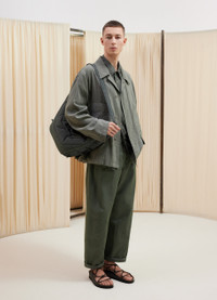 This overshirt is a new addition to LEMAIRE’s wardrobe. It is made of dry silk, a classic LEMAIRE fabric with a soft hand and tonic texture. Its loose fit allows the garment to be worn in different games of layering. The Overshirt features a classic collar and a fully concealed placket aside from a single button visible just beneath the neckline creating almost a short lapel. Its details include two chest piped patched pockets and two large flap patched pockets below, all slightly angular. DETAILS Loose fit Corozo buttons Buttoned cuffs Two flap pockets Two piped pockets Made in Hungary Style: OW1056 LF208 FABRICS & CARE Main Fabric: 76% Silk / 24% Polyamide/Nylon Soft wash 30° Do not bleach Do not tumble dry Cool ironing Soft dry clean