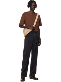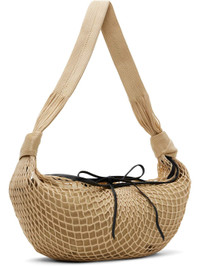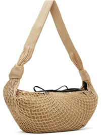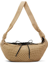 Filt® 1860 open-knit netting messenger bag. · Grained lambskin trim throughout · Fixed knit crossbody strap · Knotted detailing at strap · Self-tie closure at throat · Detachable nylon canvas zip compartment · Zip pocket at interior · H9" x W19" x D2.5" Supplier color: Light beige Textile, leather. Made in France 252646M170061