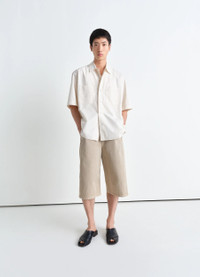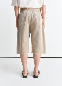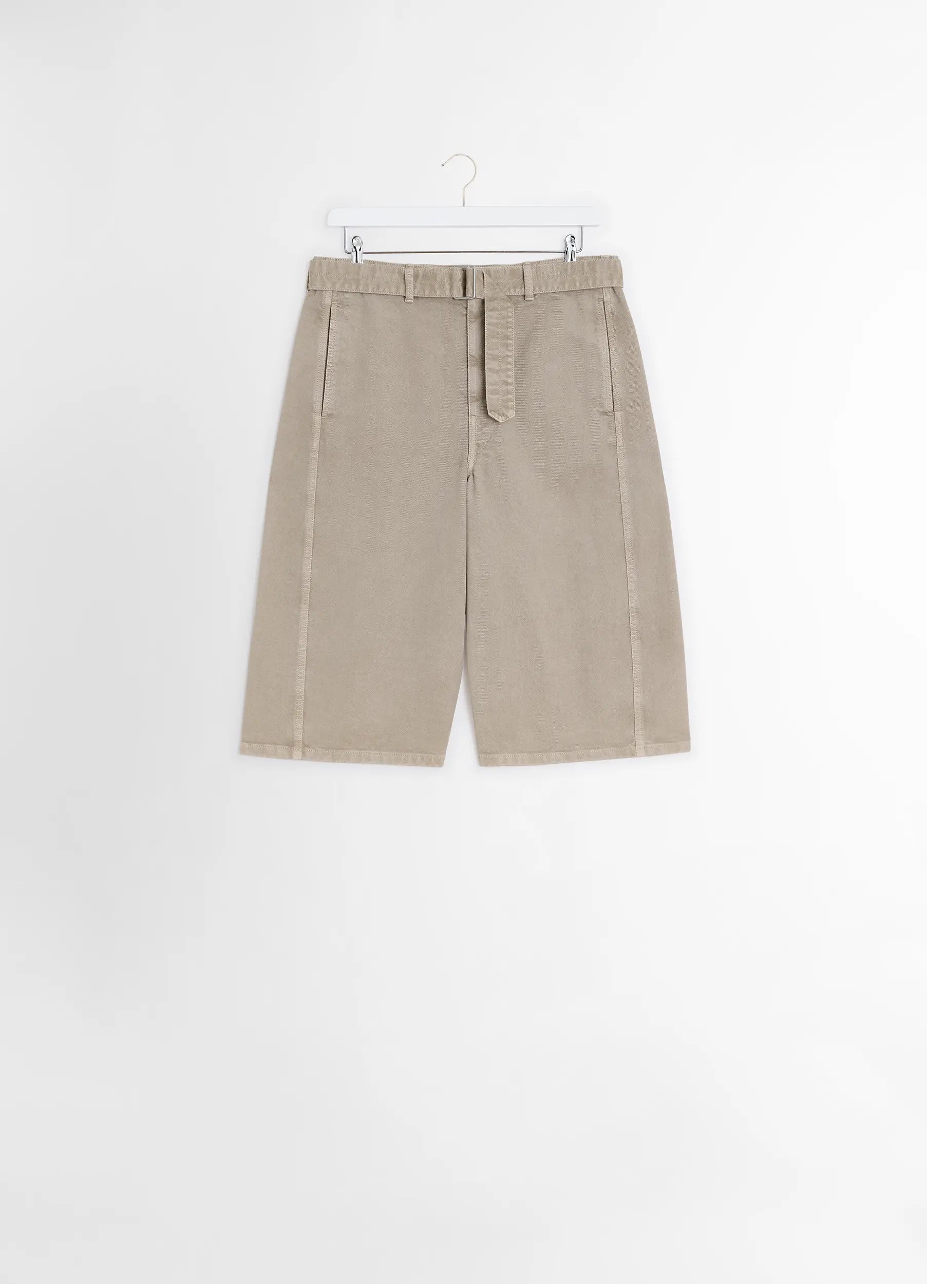 These shorts are a new member of the iconic LEMAIRE Twisted family. They are made of a heavy garment-dyed denim with a thick, round hand. This style shares some of the Twisted characteristics: its side seams are slightly twisted giving the leg a curved shape. Details also include two side pockets, two back patch pockets and a matching belt with a metal buckle to adjust the waist. DETAILS Regular fit Matching belt with metal buckle Belt loops Two back patch pockets Two side seam pockets Curved seams at the leg Zip fly Made in Morocco Style: PA1107 LD1039 The Model is 187cm / 6'1½'' ft and is wearing a size 48 (M). FABRICS & CARE Main Fabric: 100% Cotton Main Lining: 100% Cotton Soft wash 30° Do not bleach Do not tumble dry Cool ironing Soft dry clean Wash upside down Discover the traceability