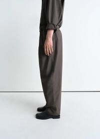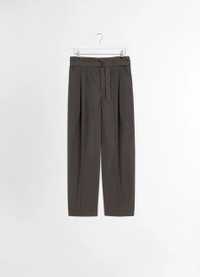 The Belted Pleated Pants are a new LEMAIRE style crafted in lightweight cotton poplin with a fluid texture, a subtle sheen and a smooth hand, and it has been garment dyed, adding to the softness of the style. They feature a relaxed carrot fit and are designed with four front pleats that enhance their structured yet laid-back silhouette. The waistband includes a self fabric belt and self-binding along the top edge. Two diagonal side pockets at the front and two jet pockets complete the utilitarian details of this relaxed tailoring piece. DETAILS - Relaxed fit - Double pleats - Belt with metal buckle - Zip fly - Belt loops Made in Slovakia Style: PA1173 LF1356 The Model is 186cm / 6'1'' ft and is wearing a size 48 (M). FABRICS & CARE Main Fabric: 100% Cotton Main Lining: 100% Cotton Soft wash 30° Do not bleach Do not tumble dry Cool ironing Soft dry clean Discover the traceability