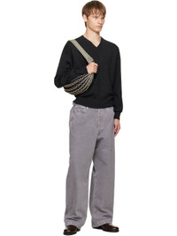 Filt® 1860 open-knit netting messenger bag. · Grained lambskin trim throughout · Fixed knit shoulder strap · Knotted detailing at strap · Self-tie closure at throat · Detachable nylon canvas zip compartment · Zip pocket at interior · H8" x W16" x D2.5" Supplier color: Chevron light beige/Black Textile, lambskin. Made in France 252646M170062