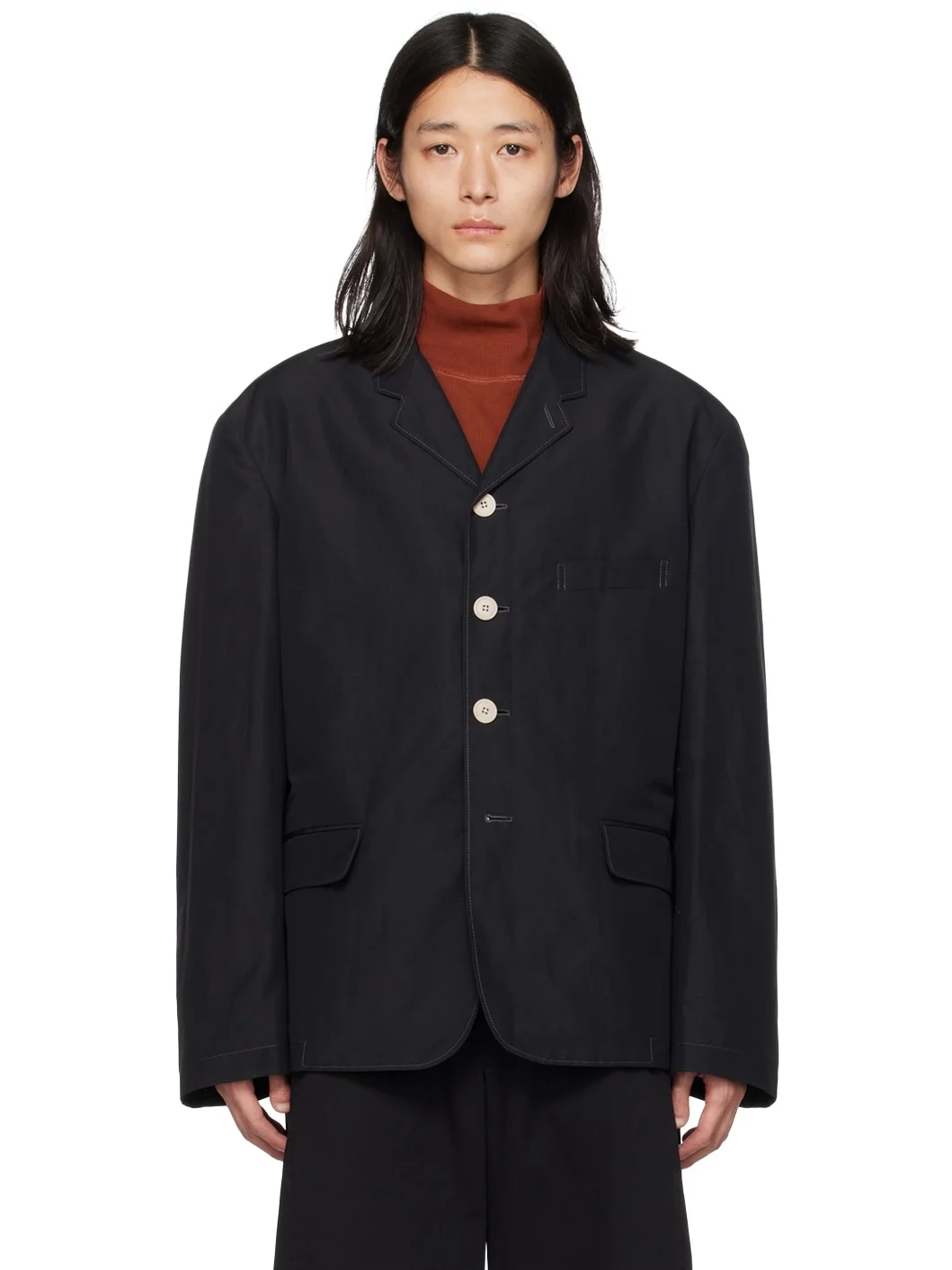 Water-repellent nylon- and linen-blend poplin blazer. · Convertible notched lapel · Button closure · Welt pocket and flap pockets · Welt pockets at interior · Partial poplin lining · Corozo hardware Supplier color: Black