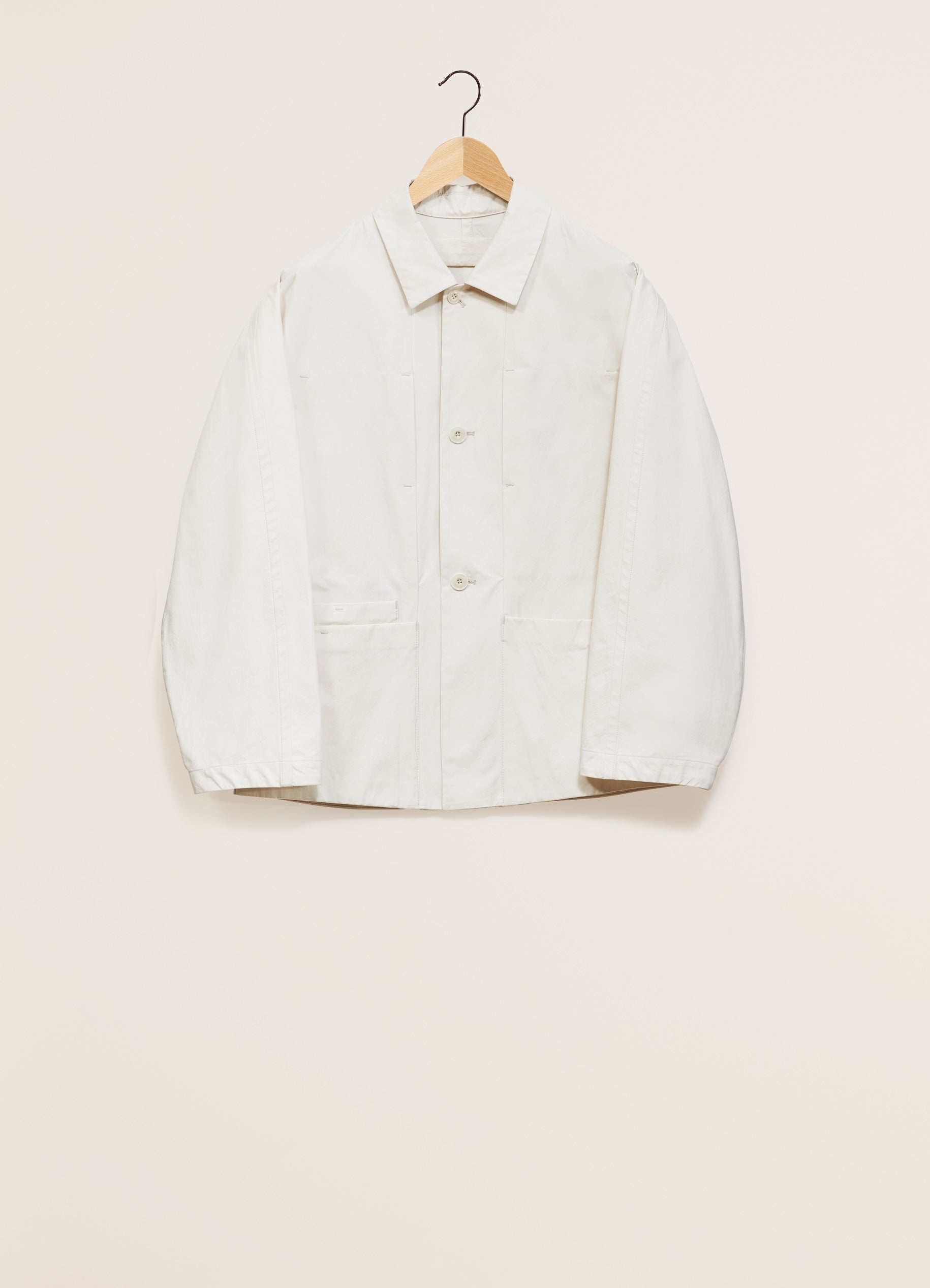 This jacket is a workwear reinterpretation of the Boxy Single Breasted Jacket, a staple of LEMAIRE’s wardrobe. It is made in cotton bachette that has been washed, granting a soft hand to the garment as well as enhancing workwear details. The boxy fit is complemented by slightly flared sleeves, accentuating the volume of the jacket. It also features two piped breasted pockets and patched pockets on the front among which one is double. DETAILS Boxy fit - Curved shape - Classic collar - Unlined - Corozo buttons - Two piped breasted pockets - Two patched pockets among which one is double Made in Romania Style: OW1075 LF1220 FABRICS & CARE Main Material: 100% Cotton Soft wash 30° Do not bleach Do not tumble dry Cool ironing Soft dry clean