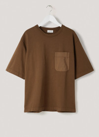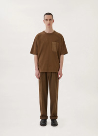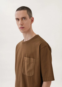 This garment-dyed t-shirt is made of cotton jersey with a soft, medium-weight hand. This classic Lemaire style has a relaxed fit, slightly dropped shoulders, a ribbed crewneck collar and boxy elbow-length sleeves. It is updated with a contrast fabric patch pocket and a back yoke seam. The open crew neck is finished with a ribbed binding detail. DETAILS Tramline stitching Ribbed collar Chest patch pocket in a slightly contrast cotton Back yoke seam Garment-dyed Loose fit Made in Portugal Style : JE312 LJ090 This model is 185 cm and is wearing a size 48/M (FR) FABRICS & CARE Garment dye medium jersey woven in Portugal 100% cotton We recommend you a 30° soft wash cleaning and cool ironing to preserve the quality of this garment.