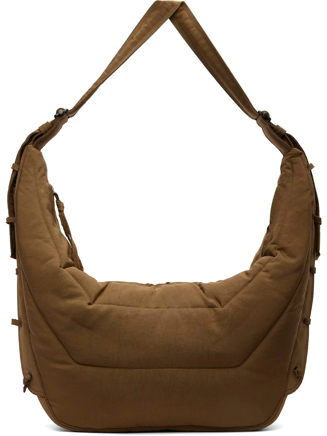 Padded and quilted recycled nylon canvas messenger bag. · GRS-certified recycled nylon · Water-repellent · Adjustable crossbody strap · Lace-up detailing at sides · Zip closure · Zip pocket at interior · H13" x W25" x D6" Supplier color: Tan Textile. Made in Italy 252646M170064