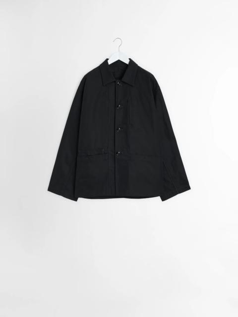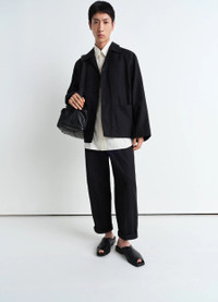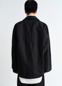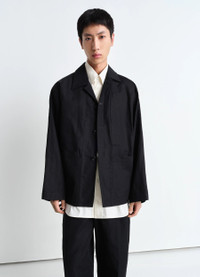 This Boxy Single Breasted Workwear Jacket is a new addition to LEMAIRE’s outerwear vestiaire. It is crafted in cotton linen gabardine, a light and fluid fabric with a soft hand, perfect for the mid-season. It features workwear characteristics such as a horizontal collar, contrast stitching, metallic buttons and adjustable cuffs. This jacket also has multiple pockets: one piped pocket on the chest and two large waist-length pockets, and in the back, a pocket with flap and one slim back pen pocket. DETAILS Unisex Relaxed fit Metal buttons Three front pockets Chest piped pocket Back pen pocket Made in Romania Style: OW1148 LF1350 The Model is 187cm / 6'1½'' ft and is wearing a size 48 (M). FABRICS & CARE Main Fabric: 60% Cotton, 40% Lined Main Lining: 100% Cotton Do not wash Do not bleach Do not tumble dry Cool ironing Soft dry clean Discover the traceability