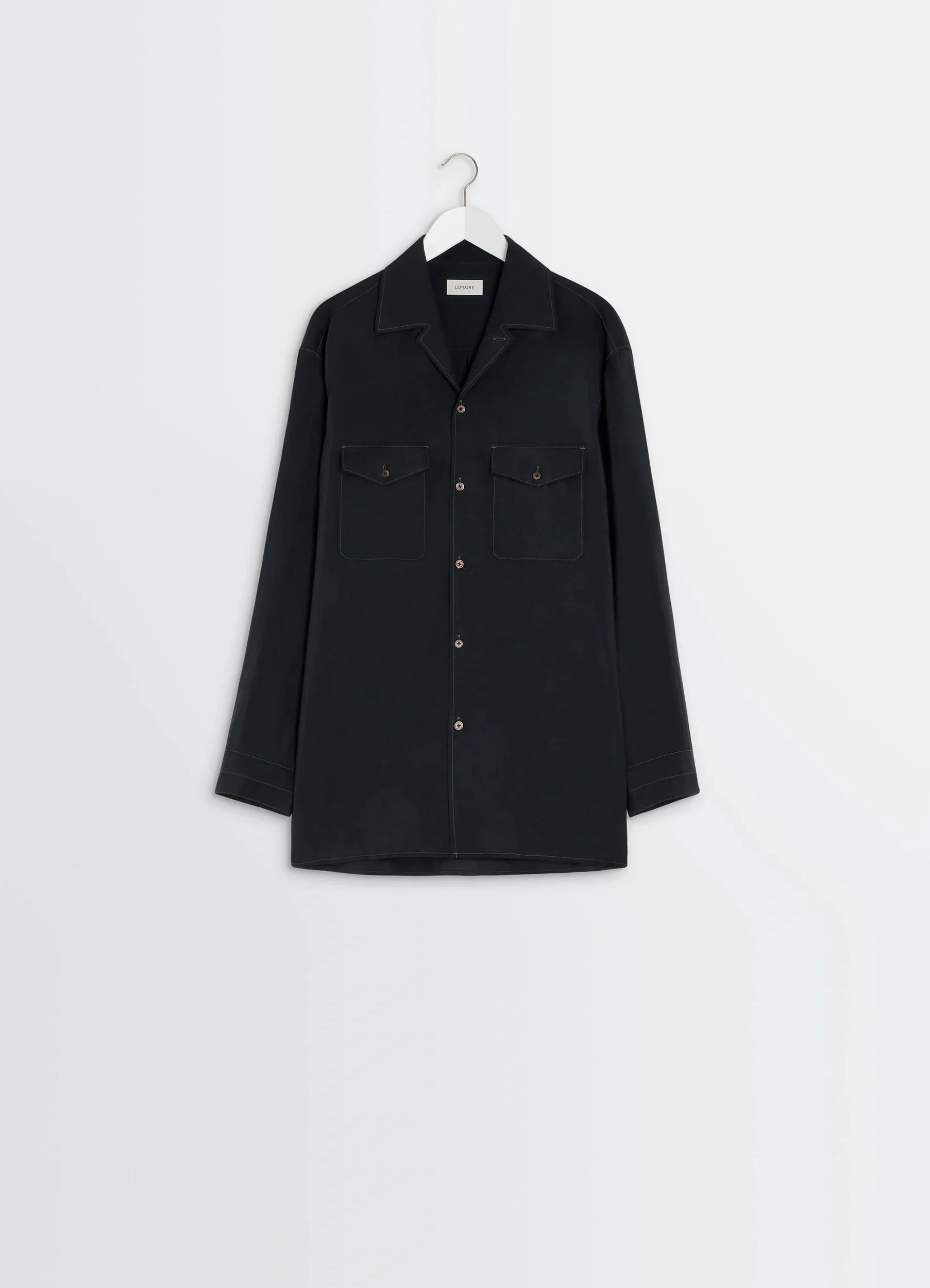 This shirt reflects Lemaire's love for versatile pieces. It features a convertible collar with an extra button to transform the piece. It is made from a dry silk blend, a classic Lemaire fabric with a soft hand and a slightly crinkled texture. DETAILS Convertible collar shirt in plain dry silk Relaxed cut Convertible collar shirt Front button closure Long sleeves Straight buttoned cuffs Chest patch pockets with button flaps Mother-of-pearl buttons Side slits Flat pleat at the back Made in Hungary Style : SH1202 LF1308 The model is 187 cm tall and is wearing a size 48 (M). FABRICS & CARE Main Material: 76% Silk 24% Polyamide