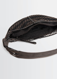 The result of a collaboration between Lemaire and Filt, the oldest French manufacturer of net shopping bags (established 1860), this bag is inspired by the iconic Croissant line and an everyday object. This piece is a 2-in-1 interpretation, achieved by combining a nylon net with a removable inner bag. DETAILS Filt Fortune Croissant bag in nylon net soft 2-in-1 design Hand or shoulder carry Woven strap with knot-style accents Outside bag in openwork nylon net Leather-tie closure Labels including a Lemaire-embossed leather and a woven Filt logo Removable nylon interior bag with snap fasteners Zipper closure with extended pull tab Nylon lining Zipped interior pocket with leather Lemaire-embossed label Dimensions: Length: 53 cm Height: 21 cm Depth: 16 cm Arrow height: 40 cm Made in France Style : BG0128 TP0006 FABRICS & CARE Main Fabric: 100% Polyester Second Fabric: 100% Lamb Main lining: 100% Polyamide/Nylon Do not wash Do not bleach Do not tumble dry Do not iron Professional leather clean only