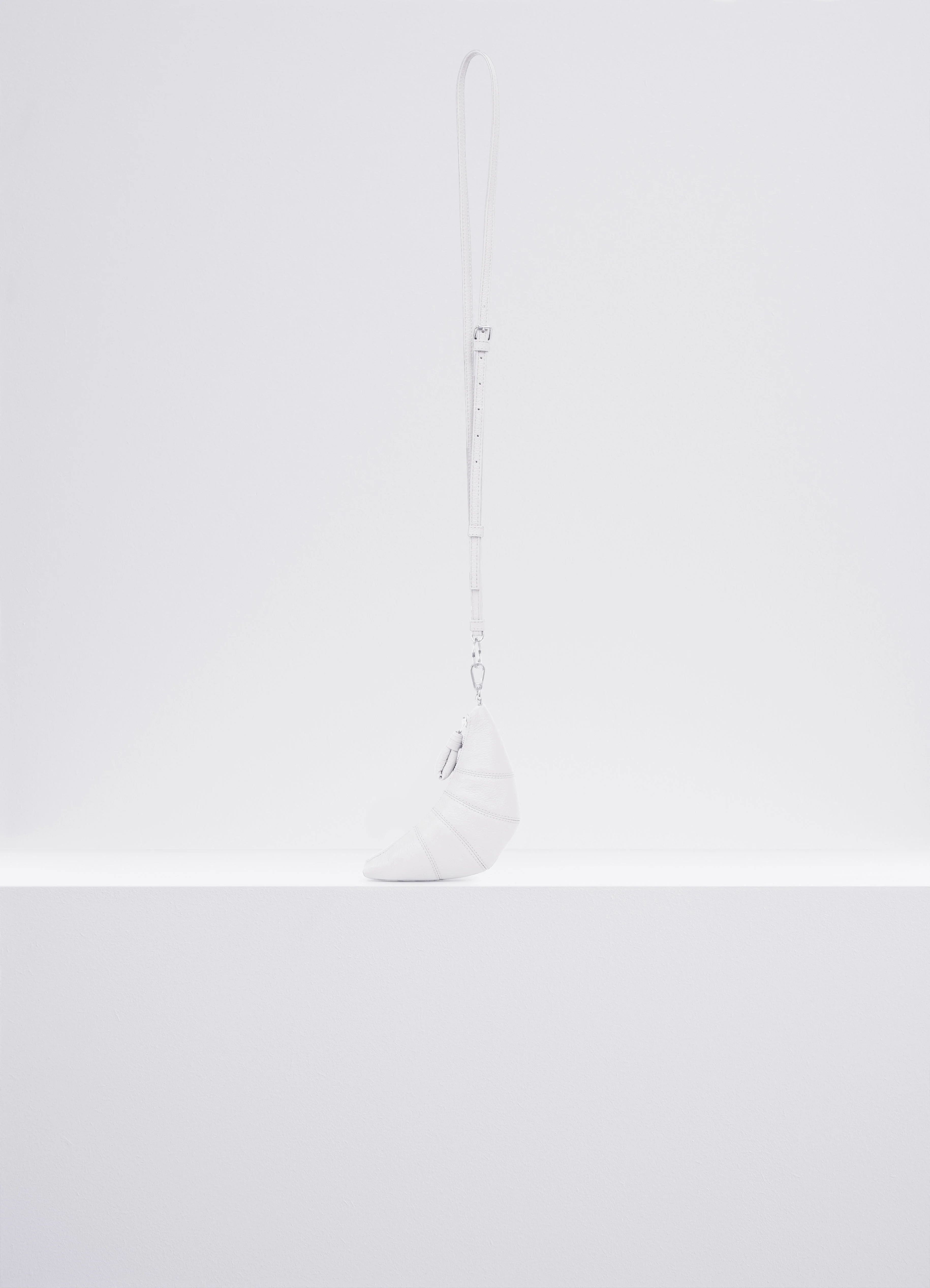 This unisex coin purse necklace is an interpretation of the iconic Croissant family. It is made of soft grained leather that is supple yet resistant. It features a zipped compartment which is large enough to fit cards or change. Topstitched cutouts follow the ergonomic lines of the purse. The long removable strap can be worn cross-body. A snap hook allows it to be combined with other pieces, like a Charm or any other ornament. DETAILS - Removable leather necklace strap - The coin purse necklace can be worn cross-body - Height of the strap: 56cm / 22in - Length: 19,5cm / 7,5in - Width: 8cm / 3in - Depth: 3cm / 1,2in - Lining in cotton canvas - Hook & ring keyring - Hook & split ring with engraved logo - Compartment (can contain cards or change) - Zipped closure - Interior embossed logo - Can be used as a charm Made in Spain Style: SL0054 LL0018 FABRICS & CARE Main Material: 100% Cow Main Lining: 100% Cotton Do not wash Do not bleach Do not tumble dry Do not iron Professional leather clean only