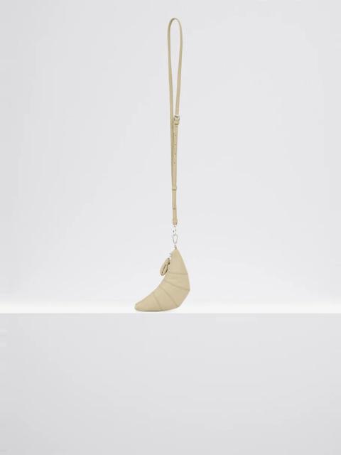 This unisex coin purse necklace is an interpretation of the iconic Croissant family. It is made of soft grained leather that is supple yet resistant. It features a zipped compartment which is large enough to fit cards or change. Topstitched cutouts follow the ergonomic lines of the purse. The long removable strap is adjustable and can be worn cross-body. A snap hook allows it to be combined with other pieces, like a Charm or any other ornament. DETAILS - Removable and adjustable leather necklace strap - The coin purse necklace can be worn cross-body - Height of the strap: 56cm / 22in - Length: 19,5cm / 7,5in - Width: 8cm / 3in - Depth: 3cm / 1,2in - Lining in cotton canvas - Hook & ring keyring - Hook & split ring with engraved logo - Compartment (can contain cards or change) - Zipped closure - Interior embossed logo - Can be used as a charm Made in Spain Style: SL0054 LL0018 FABRICS & CARE Main Material: 100% Cow Main Lining: 100% Cotton Do not wash Do not bleach Do not tumble dry Do not iron Professional leather clean only