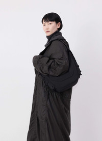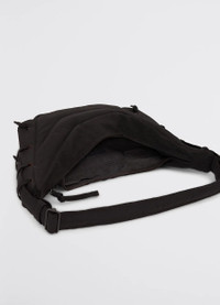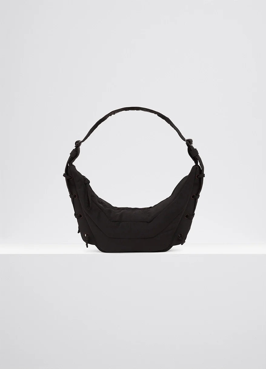 This unisex bag is part of the Soft Game bag family. The Small Soft Game is made of a slightly fluffy-nylon canvas treated with a water-repellent finish - GRS certified. Its wadded fabric gives the bag a matte surface and a sturdy structure which holds its shape over time. Inspired by the Croissant bag, it is lightweight yet functional thanks to its padded adjustable strap and its interior zipped pocket. It has the capacity for accessories such as a smartphone or a 4x7-inch book. On both sides of the bag, embroidered eyelets and laces allow its volume to be adapted. Ideal for daily use, this style can be worn as a shoulder or a cross-body bag. DETAILS - This bag can be worn on the shoulder or cross-body - Height of the shoulder strap: 60cm / 24in - Length: 52cm / 20,5in - Width: 19cm / 7,5in - Depth: 13cm / 5in - Lining in nylon - Adjustable nylon strap with metal buckle - Zipped opening with puller from the same fabric - Interior zipped patch pocket (can contain small accessories: card holder or Airpods Pro 2 case) - Main compartment (can contain small accessories: smartphone, wallet) - Garment dyed - Water-repellent finishes keep rain and splashes out, but are not waterproof Made in Italy Style: BG293 LF1330