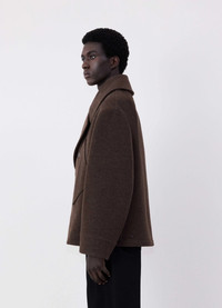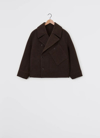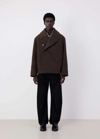 The Dispatch Peacoat, a classic from the LEMAIRE wardrobe, makes a return this season. Reimagined in a deep brown chine yarn-dyed double wool for a soft, warm wear, this essential features a peaked lapel and double-breasted button closures, so it can be worn either open or buttoned up. The coat boasts a diagonal patch pocket with a buttoned closure, as well as two inseam pockets on the side. The dropped shoulders and adjustable button tabs at the back of the cuffs ensure one stays warm and comfortable. DETAILS - Boxy fit - Dropped shoulders - Diagonal front pocket - Inseam pockets - Adaptable cuffs Made in Lithuania Style: OW1114 LF1117 FABRICS & CARE Main Fabric: 100% Viscose Main Lining: 100% Cotton Do not wash Do not bleach Do not tumble dry Cool ironing Soft dry clean