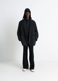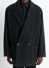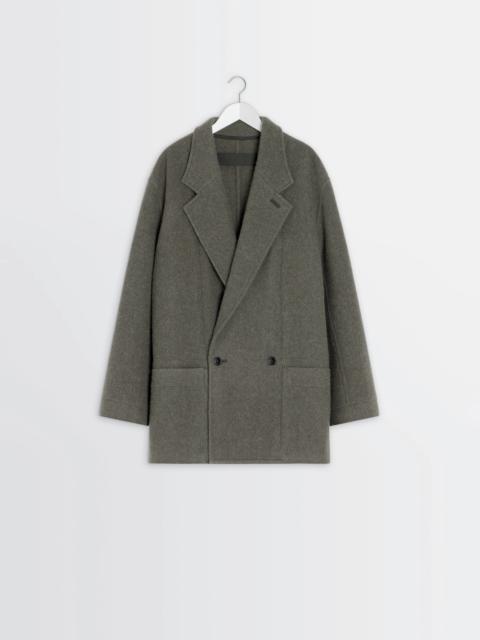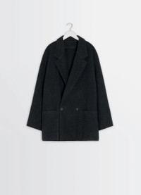 This felted wool piece is inspired by Lemaire's iconic work jacket, reinterpreted here in a rich, warm material. The wool and alpaca blend gives it texture and relief as well as lightness. This unlined piece is finished with a herringbone ribbon trim. The model is 187 cm tall and is wearing a size 48 (M). DETAILS Felt wool and alpaca blend jacket Oversized cut Unlined model Tailored collar with buttonhole and under-button collar Long sleeves Double-breasted closure Patch side pockets Inside patch pockets Interior strap at the neck for hand carryInterior herringbone ribbon trim Made in Romania Style : CO1148 LF504 The model is 187 cm tall and is wearing a size 48 (M). CARE Main Material: 50% Wool 50% Alpaca Main Lining: 100% Cotton Do not wash Do not bleach Do not tumble dry Cool ironing Soft dry clean