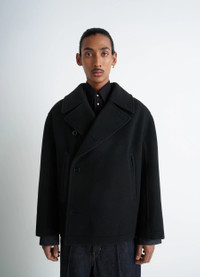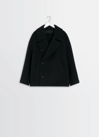 This short peacoat is a classic in Lemaire's winter wardrobe. Made from double-faced wool, it is supple, soft, and warm. The model is 187 cm tall and is wearing a size 48 (M). DETAILS Short double-faced wool peacoat Boxy cut Supple unlined model Tailored collar with buttonholes and under-collar buttons Long sleeves Double-breasted closure Welted side pockets Adjustable button tabs at the back Interior strap at the neck for hand carry Made in Lithuania Style : CO1131 LF1116 The model is 187 cm tall and is wearing a size 48 (M). CARE Main Material: 100% Wool Main Lining: 100% Cotton Do not wash Do not bleach Do not tumble dry Cool ironing Soft dry clean