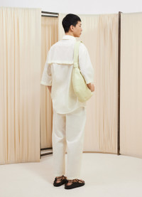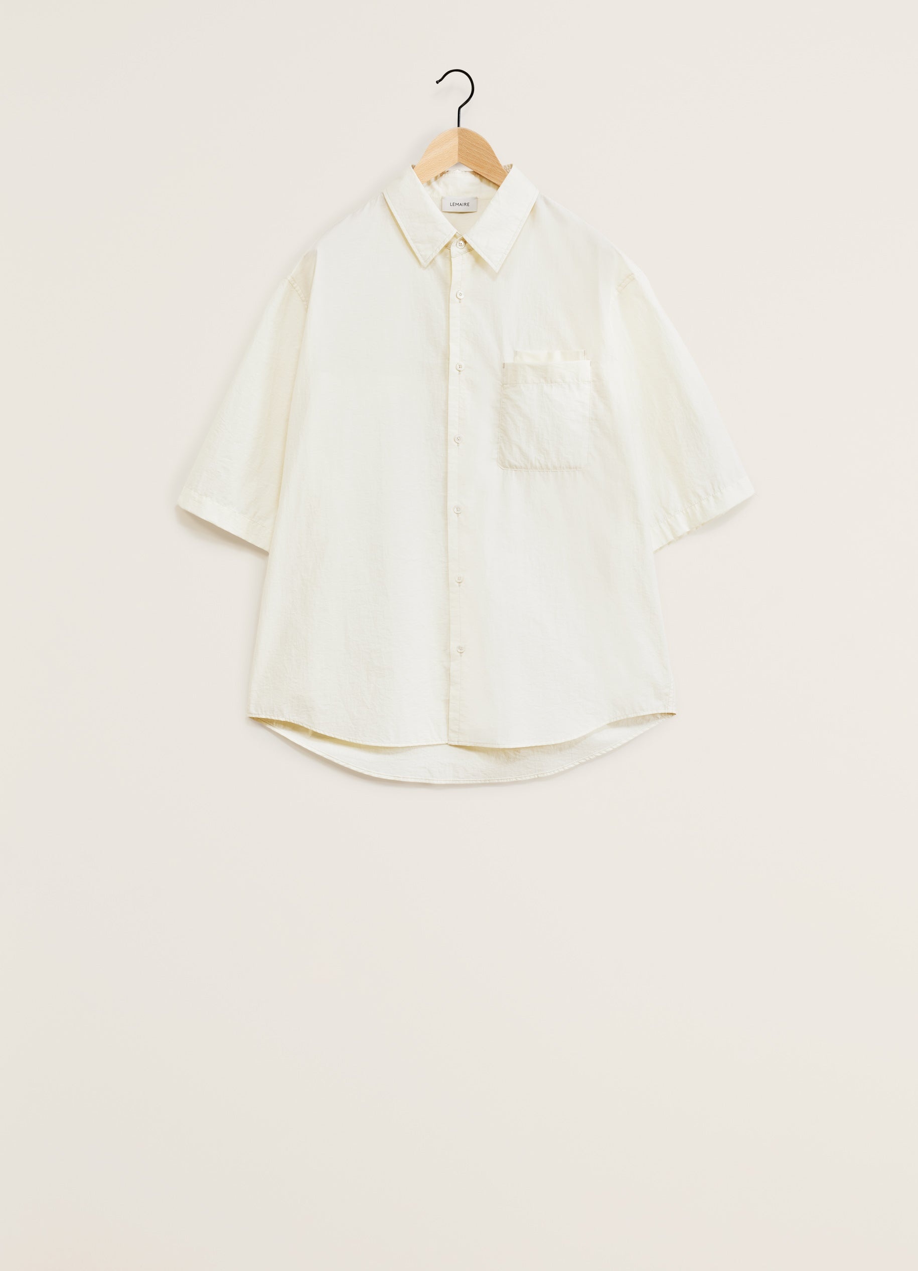 This shirt is a new addition to LEMAIRE’s wardrobe. It is made from a blend of cotton and nylon that has undergone a thorough wash, hence the slightly nibbled seams, granting the garment fluidity. The Double Pocket Short Sleeve Shirt has a relaxed fit with a smooth construction accented by a pointed collar and slightly rounded hem. It features a frontside double pocket. DETAILS Relaxed fit Straight collar Mother-of-pearl buttons Made in Romania Style: SH1079 LF1234 FABRICS & CARE Main Material: 84% Coton / 16% Polyamide Do not wash Do not bleach Do not tumble dry Cool ironing Soft dry clean