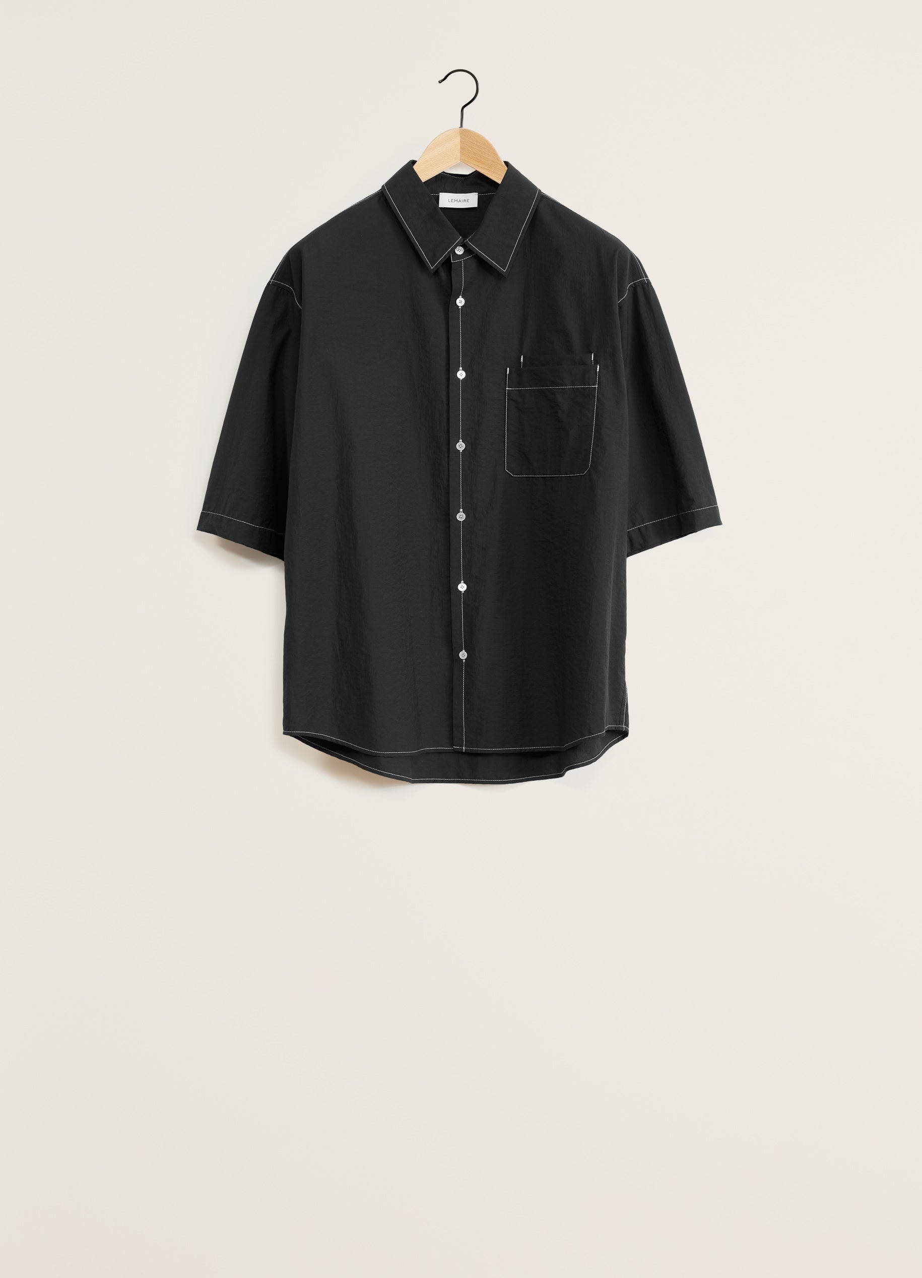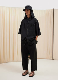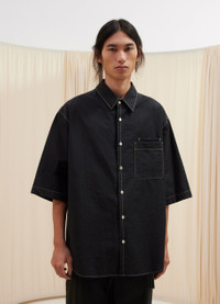 This shirt is a new addition to LEMAIRE’s wardrobe. It is made from a blend of cotton and nylon that has undergone a thorough wash, hence the slightly nibbled seams, granting the garment fluidity. The Double Pocket Short Sleeve Shirt has a relaxed fit with a smooth construction accented by a pointed collar and slightly rounded hem. It features a frontside double pocket. DETAILS Relaxed fit Straight collar Mother-of-pearl buttons Made in Romania Style: SH1079 LF1234 FABRICS & CARE Main Material: 84% Coton / 16% Polyamide Do not wash Do not bleach Do not tumble dry Cool ironing Soft dry clean