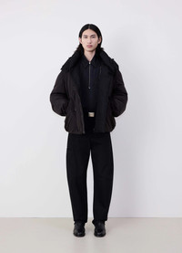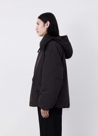 This Hooded Puffer Blouson is a wadded jacket illustrating the outdoor side of the LEMAIRE vestiaire. The shell is from a light cotton blend with a technical, water-repellent finish. It is wadded with recycled down and boasts a high protective collar. The peaked hood is both detachable and adjustable — thanks to four cinching adjusters, and the blouson is fully lined in contrast cotton. Slightly double-breasted, this jacket's buttoning system includes four buttons down the front with a piece of elastic cord to tie them up and a hidden zip closure underneath the wrap over. There are also two parka-inspired pocket flaps with hidden buttons on each side, and two darts in the back shoulders to shape the rounded puffer jacket silhouette. DETAILS - Relaxed fit - Recycled down - Double fastening system - Elastic cords and button closures - Pocket flaps - Detachable and adjustable hood Made in Tunisia Style: OW1093 LF1156 FABRICS & CARE Main Fabric: 59% / 41% Polyamide/Nylon Main Lining: 100% Cotton Second Lining: 100% Cotton Do not wash Do not bleach Do not tumble dry Cool ironing Soft dry clean