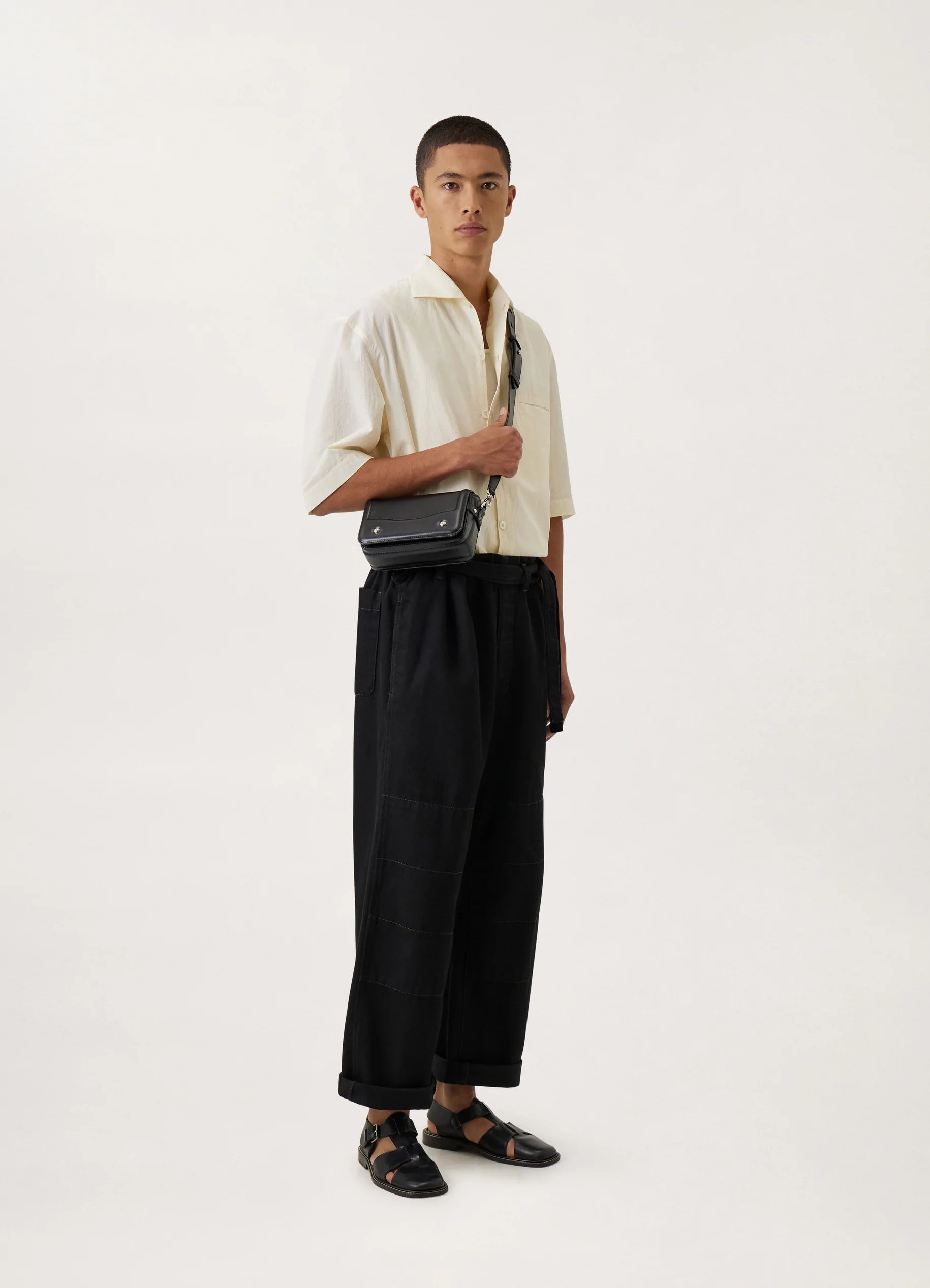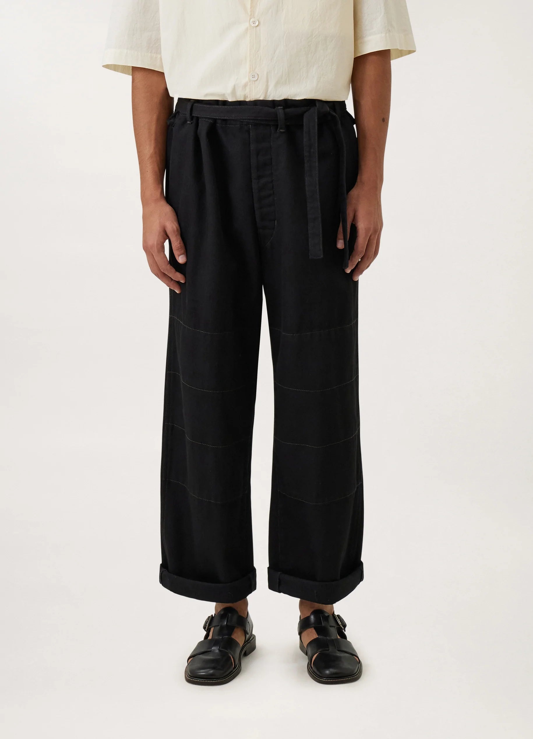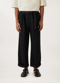 These pants are made of denim with a visible twill weave and a deep black wash. Their relaxed volume is gathered at the waist with an attached belt that can be wrapped twice. The leg is long and wide, their outline, belt loops, pockets and knees are reinforced with contrast topstitching. DETAILS Removable matching belt Corozo buttons Midrise Buttoned fly Two sideseam pockets Back patch pocket Relaxed fit Made in Morocco Style : PA1033 LD1004 FABRICS & CARE Main Material: 100% Cotton Main Lining: 100% Cotton Soft wash 30° Do not bleach Do not tumble dry Cool ironing Soft dry clean