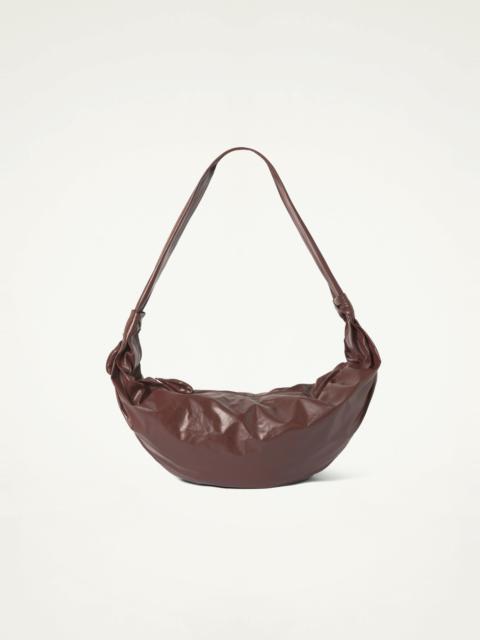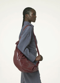 This bag, the largest of the Croissant family, is made of paper-like leather that is lightweight and resistant, with a lightly shiny finish. Inspired by the shape of a croissant pastry, the smooth body is draped from below the knotted strap, creating gathers on either side. Its ergonomic shape wraps around the body for an easy, casual wear. It features a matching looped zip puller and a removable A5 pouch. It can be worn as a shoulder or cross-body bag. DETAILS Cotton canvas lining Metal zip Interior patch pocket Interior zipped pocket Removable A5 pouch Made in Tunisia Style : BG0027 LL0028 FABRICS & CARE Main Fabric : 100% Cow Main Lining : 100% Coton Do not wash Do not bleach Do not tumble dry Do not iron Professional leather clean only