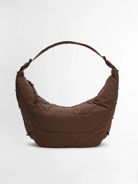 This unisex bag is the largest of the Soft Game family. It is made of a slightly fluffy-nylon canvas treated with a water-repellent finish - GRS certified. Its wadded fabric gives the bag a matte surface and a sturdy structure that holds its shape over time. Inspired by the Croissant bag, the Large Soft Game is lightweight yet functional thanks to its padded adjustable strap and its interior zipped pocket. It has the capacity for accessories such as a smartphone, a 4x7-inch book or a 13-inch laptop computer and more. On both sides of the bag, embroidered eyelets and laces allow its volume to be adapted. Ideal as a weekend bag, this style can be worn as a shoulder or a cross-body bag. DETAILS - This bag can be worn on the shoulder or cross-body - Height of the shoulder strap: 60cm / 24in - Length: 75cm / 30in - Width: 32,5cm / 12,8in - Depth: 17cm / 6,7in - Lining in nylon - Adjustable nylon strap with metal buckle - Zipped opening with puller from the same fabric - Interior zipped patch pocket (can contain small accessories: smartphone, wallet, card holder or Airpods Pro 2 case) - Main compartment (can contain accessories: 4x7-inch book, 13-inch laptop computer) - Garment dyed - Water-repellent finishes keep rain and splashes out, but are not waterproof Made in Italy Style: BG0105 LF1330 FABRICS & CARE Main Fabric: 100% Polyamide/Nylon Main lining: 100% Polyamide/Nylon Do not wash Do not bleach Do not tumble dry Do not iron Professional leather clean only