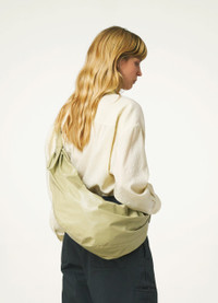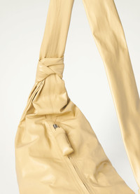 This bag, the largest of the Croissant family, is made of paper-like leather that is lightweight and resistant, with a lightly shiny finish. Inspired by the shape of a croissant pastry, the smooth body is draped from below the knotted strap, creating gathers on either side. Its ergonomic shape wraps around the body for an easy, casual wear. It features a matching looped zip puller and a removable A5 pouch. It can be worn as a shoulder or cross-body bag. DETAILS Cotton canvas lining Metal zip Interior patch pocket Interior zipped pocket Removable A5 pouch Made in Tunisia Style : BG0027 LL0028 FABRICS & CARE Main Fabric : 100% Cow Main Lining : 100% Coton Do not wash Do not bleach Do not tumble dry Do not iron Professional leather clean only