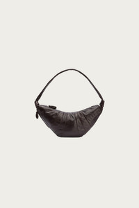 The Croissant line is emblematic of the Lemaire wardrobe. This supple, versatile bag features a curve inspired by the Viennoiserie of the same name, created by an assembly of topstitched panels. It is reinterpreted here with a shoulder strap in smooth, embossed leather with a rail motif. This large bag is made from LWG Gold-certified grained leather, a thick, resistant material characterized by its textured look. - Zipped side pocket with quilted pull tab - Zipper closure with quilted pull tab - Cotton canvas lining and inside card pocket - Lemaire embossed interior leather label - Inside zipped pouch in leather, removable with snap tab and ring - Silver-plated metalwork - Made in Spain - Length: 53 cm, Height: 28 cm, Depth: 10 cm, Arrow height: 37 cm, Strap length: 70 cm