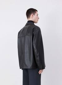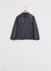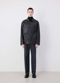 This new take on the LEMAIRE stand collar shirt explores new textural territories. It is reimagined this season in a soft, shiny and light weight lamb leather with a buttery feel. This square style comes fully lined in viscose twill for an easy and comfortable wear. Its raised collar may be worn up or pushed down depending on the occasion. This shirt also features two diagonally-cut patch pockets in the front, a buttoned centre front and buttoned cuffs. DETAILS - Square fit - Stand collar - Fully lined - Patch front pockets Made in Turkey Style: OV1006 LL0094 FABRICS & CARE Main Fabric: 100% Lamb Main Lining: 51% Cotton / 49% Viscose Do not wash Do not bleach Do not tumble dry Do not iron Professional leather clean only