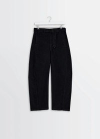 These belted Twisted pants are a classic unisex piece from the Lemaire wardrobe, with their twisted seams giving a rounded shape to the leg and a removable belt. They're made from Lemaire's signature thick denim in a deep black wash. The models are 177 cm and 187 cm and are wearing sizes 36 (S) and 48 (M). We recommend a size down These belted Twisted pants are a classic unisex piece from the Lemaire wardrobe, with their twisted seams giving a rounded shape to the leg and a removable belt. They're made from Lemaire's signature thick denim in a deep black wash. The models are 177 cm and 187 cm and are wearing sizes 36 (S) and 48 (M). We recommend a size down DETAILS Twisted belted pants in heavy black denim Regular fit Belt loops at the waistband Matching removable belt with metal buckle Closure with hook, button, and hidden zipper Side seam pockets Back patch pockets Lemaire embossed leather jacron at the back Twisted seams Contrast topstitching We recommend a size down Made in Morocco Style : PA326 LD1055 Twisted belted pants in heavy black denim Regular fit Belt loops at the waistband Matching removable belt with metal buckle Closure with hook, button, and hidden zipper Side seam pockets Back patch pockets Lemaire embossed leather jacron at the back Twisted seams Contrast topstitching We recommend a size down Made in Morocco Style : PA326 LD1055 CARE Main Material: 100% Cotton Main Lining: 100% Cotton Jacron: 100% Cow Leather Soft wash 30° Do not bleach Do not tumble dry Cool ironing Soft dry clean Wash upside down Main Material: 100% Cotton Main Lining: 100% Cotton Jacron: 100% Cow Leather Soft wash 30° Do not bleach Do not tumble dry Cool ironing Soft dry clean Wash upside down