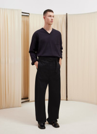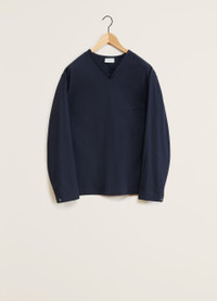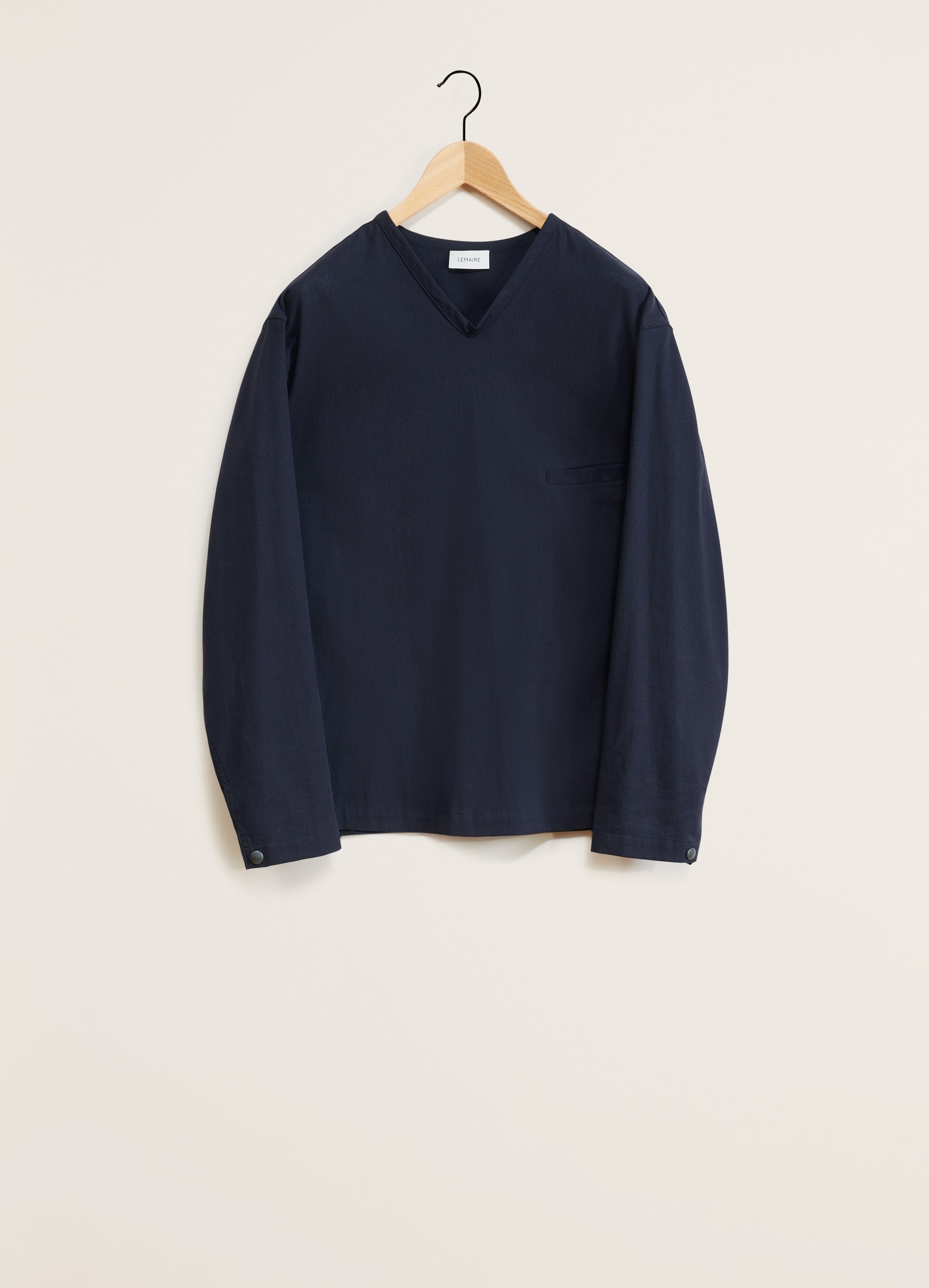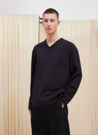 This top is a new addition to LEMAIRE’s wardrobe. It is made in light cotton with a broken twill weave, providing a subtle, yet textural design. The garment has been worked with bias details emphasizing the silhouette. The Long Sleeve V-Neck Top features a V-collar with rib finishing almost culminating into a cowl neck. Cuffs can be adjusted thanks to a snap. Details include a chest piped pocket. DETAILS Straight fit V-collar Chest piped pocket Made in Romania Style: TO1232 LF1253 FABRICS & CARE Main Material: 100% Cotton Soft wash 30° Do not bleach Do not tumble dry Cool ironing Soft dry clean