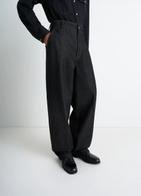 These oversized barrel-cut pants reflect Lemaire's love for workwear and reinterpretation of archetypal pieces. Crafted in thick yarn-dyed slate denim with a raw hand, which adds a sophisticated touch to the silhouette. DETAILS Barrel workwear pants in yarn-dyed heavy slate denim Oversized cut Belt loops at the waistband Button closure with hidden zipper Ornamental button Distinct front and black pleats Italian side pockets Ticket pocket Back patch pockets Lemaire embossed leather jacron at the back Metal rivets Contrast topstitching Made in Italy Style : PA1261 LD1061 The model is 187 cm tall and is wearing a size 48 (M). FABRICS & CARE Main Material: 100% Cotton Main Lining: 65% Polyester 35% Cotton Jacron: 100% Cow Leather