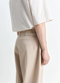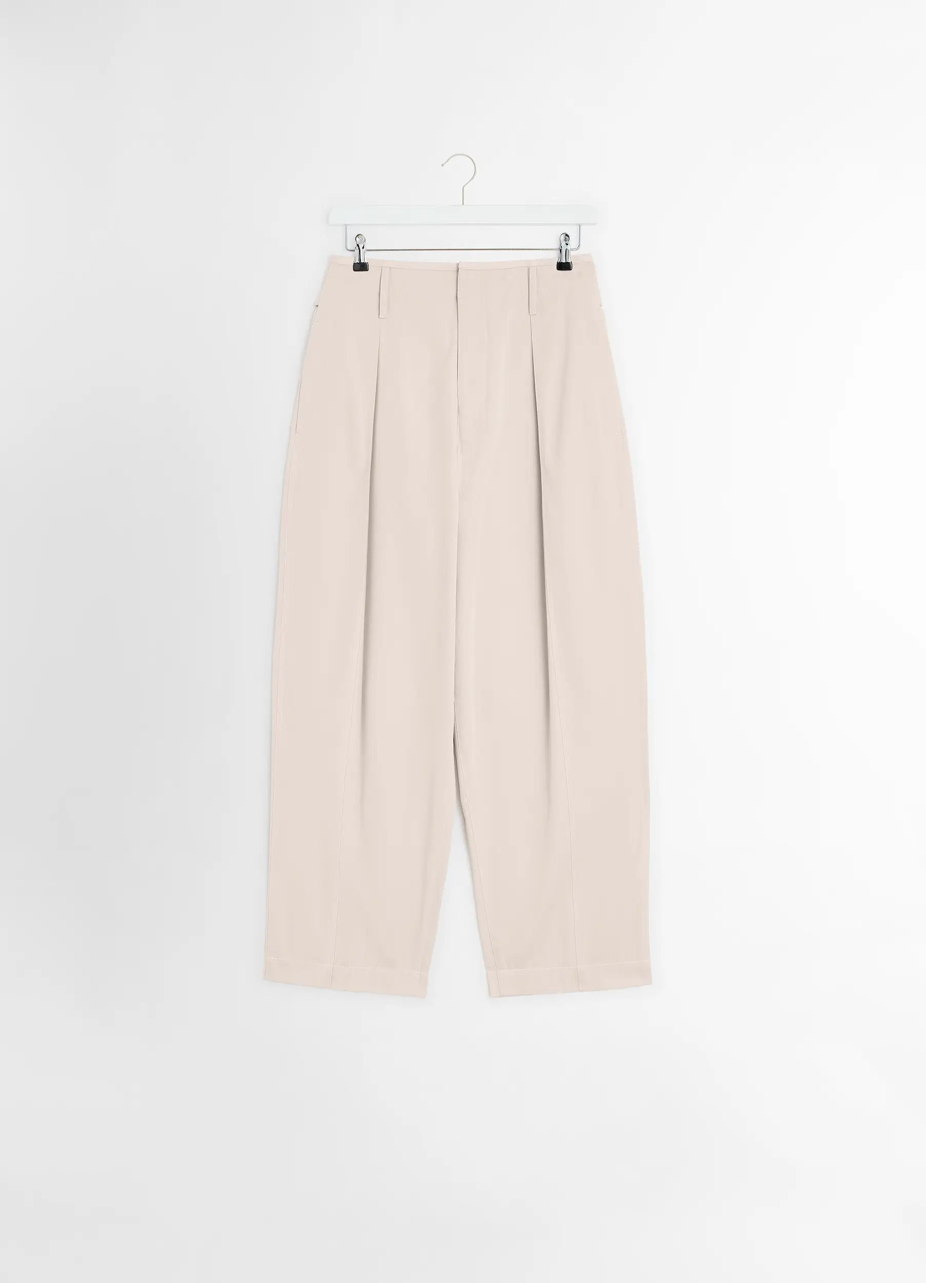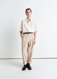 These Maxi Pleated Pants are crafted in compact cotton twill, a light yet structured material with a textured hand. Designed for a confortable fit, they feature deep front pleats that create a dynamic silhouette. The waistband includes both a belt and belt loops. Topstitching details highlight the side pockets, while welt pockets at the back add functional elegance. The design is completed with a zip fly and a seam that runs down the center front of the trousers, enhancing the utilitarian aesthetic. DETAILS - Relaxed fit - Tapered leg - Zipped fly - Corozo button - Side piped pocket - Two patch pockets in the back - Topstitching detail - Belt loops Made in Morocco Style: PA1202 LF1352 The Model is 188cm / 6'2'' ft and is wearing a size 48 (M). FABRICS & CARE Main Fabric: 100% Cotton Main Lining: 100% Cotton Soft wash 30° Do not bleach Do not tumble dry Cool ironing Soft dry clean