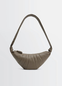 The Croissant line is emblematic of the Lemaire wardrobe. This versatile, supple bag features a curve inspired by the Viennoiserie of the same name, created by an assembly of topstitched panels and knotted elements. This medium bag is crafted in grained leather, a supple yet resistant material characterized by its textured look. DETAILS Medium Croissant bag in leather souple graine Hand, shoulder, and crossbody carry Soft model with stitched panels Strap with knot-style details Zipper closure with quilted pull tab Cotton canvas lining and inside card pocket Lemaire embossed interior leather label Silver-plated metalwork >Dimensions: Length: 47 cm Height: 23 cm Depth: 7 cm Arrow height: 42 cm Strap length: 96 cm Made in Spain Style : BG0001 LL0018 FABRICS & CARE Main material: 100% cow Main lining: 100% cotton Do not wash Do not bleach Do not tumble dry Do not iron Professional leather clean only