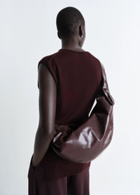This bag is part of the Soft Croissant line, a new interpretation of the iconic Croissant family. It is made of leather that is lightweight yet resistant with a slightly shiny finish, mimicking the texture of paper and creating a distinctive tactile experience. This version keeps the main signatures of the Croissant with its shape inspired by the pastry of the same name, the wadded pullers and the side knot finishings. Its body is draped from below the knotted strap, creating gathers on either side. The Medium Soft Croissant features a lateral zipped pocket as well as an interior zip patch pocket. It has the capacity for small accessories such as a smartphone, a card holder, a wallet and a 4x7-inch book. Worn as a shoulder or cross-body bag, its ergonomic shape wraps around the body for an easy, casual wear. DETAILS This bag can be worn on the shoulder or cross-body Height of the shoulder strap: 33 cm / 13 in Lining in cotton canvas Metal Looped zip puller Interior zip patch pocket (can contain small accessories: card holder or Airpods Pro 2 case) Interior patch pocket (can contain small accessories: keys or wallet) Lateral zipped pocket (can contain small accessories) Main compartment (can contain accessories: smartphone, 4x7-inch book) Side knot finishings Embossed logo inside Made in Tunisia Style: BG0091 LL0028 FABRICS & CARE Main Fabric: 100% Cow Main Lining: 100% Coton Do not wash Do not bleach Do not tumble dry Do not iron Professional leather clean only