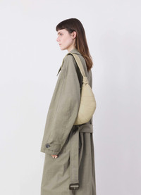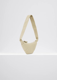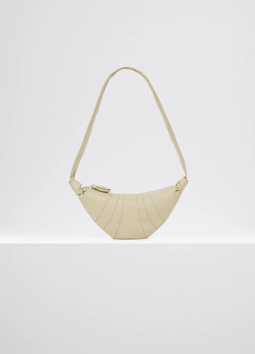 This classic LEMAIRE bag is part of the iconic Croissant family. The Small Croissant is made of soft grained leather, a supple yet resistant fabric. Its distinctive surface adds a tactile element and contributes to the durability of the bag’s curve. Inspired by the shape of the croissant pastry, its design is achieved through an assembly of top-stitched cutouts, blending style and functionality. It also features a matching looped zip puller and side knot finishings. The Small Croissant has the capacity for small accessories such as a smartphone, a card holder and a wallet. This versatile style can be worn over the shoulder or cross-body. DETAILS - This bag can be worn on the shoulder or cross-body - Height of the shoulder strap: 43cm / 17in - Length: 35cm / 14in - Width: 16cm / 6in - Depth: 5cm / 2in - Lining in cotton canvas - Metal Looped zip puller - Small interior patch pocket (can contain cards, small keys or a public transportation pass) - Main compartment (can contain smartphone, card holder, Airpods Pro 2 case and wallet) - Side knot finishings - Embossed logo inside Made in Spain Style: BG0003 LL0018 FABRICS & CARE - Main Material: 100% Cowhide Leather - Main Lining: 100% Cotton - Do not wash - Do not bleach - Do not tumble dry - Do not iron - Professional leather clean only