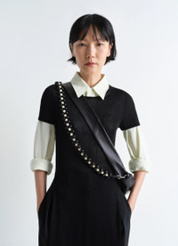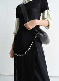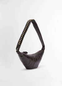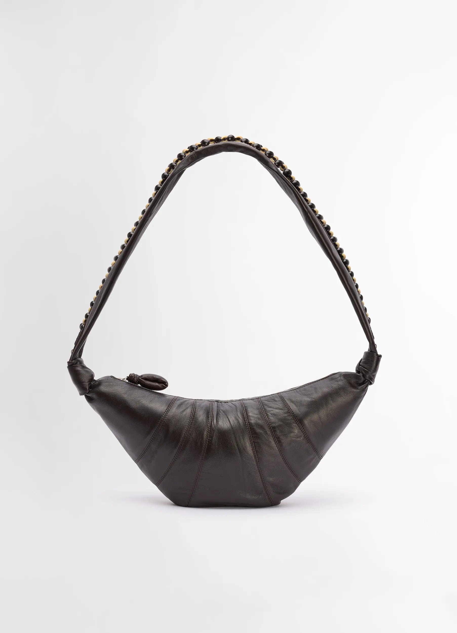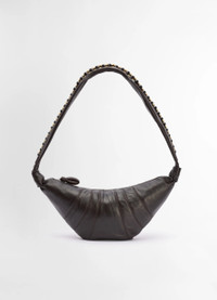 The iconic Croissant bag gets a makeover this season with the debut of this Pearls Medium Croissant style. Made in a souple nappa leather with a shiny finish and a soft hand, it features two straps: a classic leather one, and an extra strap ornated with voluminous beads. This decorative strap can either be worn over the shoulder or left hanging below the main body of the bag for a more dramatic effect. Inspired by the shape of the eponymous pastry, the Croissant silhouette is achieved through an assembly of top-stitched cutouts, blending style and functionality. It features a matching looped zip puller and side knot finishings and has the capacity for accessories such as a smartphone or 4x7-inch book. This versatile style can be worn over the shoulder or cross-body. DETAILS - This bag can be worn on the shoulder or cross-body - Height of the shoulder strap: 43cm / 17in - Length: 16cm / 6in - Width: 35cm / 6in - Depth: 5cm / 2in - Lining in cotton canvas - Metal Looped zip puller - Interior patch pocket (can contain card holder, Airpods Pro 2 case, keys or wallet) - Main compartment (can contain a smartphone, Air or 4x7-inch book) - Side knot finishings - Embossed logo inside Made in Spain Style: BG0158 LL095 FABRICS & CARE Main Material: 100% Lamb Second Material: 100% Polyester Main Lining: 100% Cotton Do not wash Do not bleach Do not tumble dry Do not iron Professional leather clean only