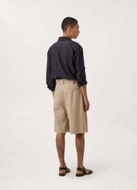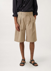 These shorts are made of cottonviscose gabardine that is compact and lightweight, with a cool surface that is ideal for summer temperatures. Their bermuda shape is accented by a grownon waistband that is adjustable using the buckled tabs on either side. They feature a wide leg that is achieved by double pleating from the waist down, with pressed creases. DETAILS Corozo button Adjustable rise Belt loops Hidden hook and button closure Two sideseam pockets Two buttoned back jet pockets Made in Bulgaria Style : PA1034 LF1025 This model is 189 cm and is wearing a size 48/M (FR) FABRICS & CARE Main Material: 54% Viscose 46% Cotton Main Lining: 100% Cotton Do not wash Do not bleach Do not tumble dry Cool ironing Soft dry clean