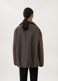 The Lemaire Puffer Jacket is crafted from a durable, water-repellent cotton-nylon blend, offering warmth and protection in colder weather. Its relaxed, slightly cropped fit is accentuated by an offset front opening and a high, convertible stand collar. Functional features include side seam pockets, a chest pocket, and two interior pockets, while the fully lined quilted interior provides a rounded silhouette. The jacket is fastened with corozo buttons, making it a stylish and practical choice for the modern wardrobe. DETAILS Corozo buttons High convertible collar Two side-seam pockets One chest seam pocket Two interior pockets Loose fitMade in Bulgaria Style : CO187 LF840This model is 183 cm and is wearing a size 48/M (FR) FABRICS & CARE Water repellent cotton nylon twill woven in Italy 68% cotton 32% polyamide We recommend that you make use of professional dry-cleaning to take care of your garment.