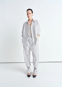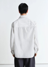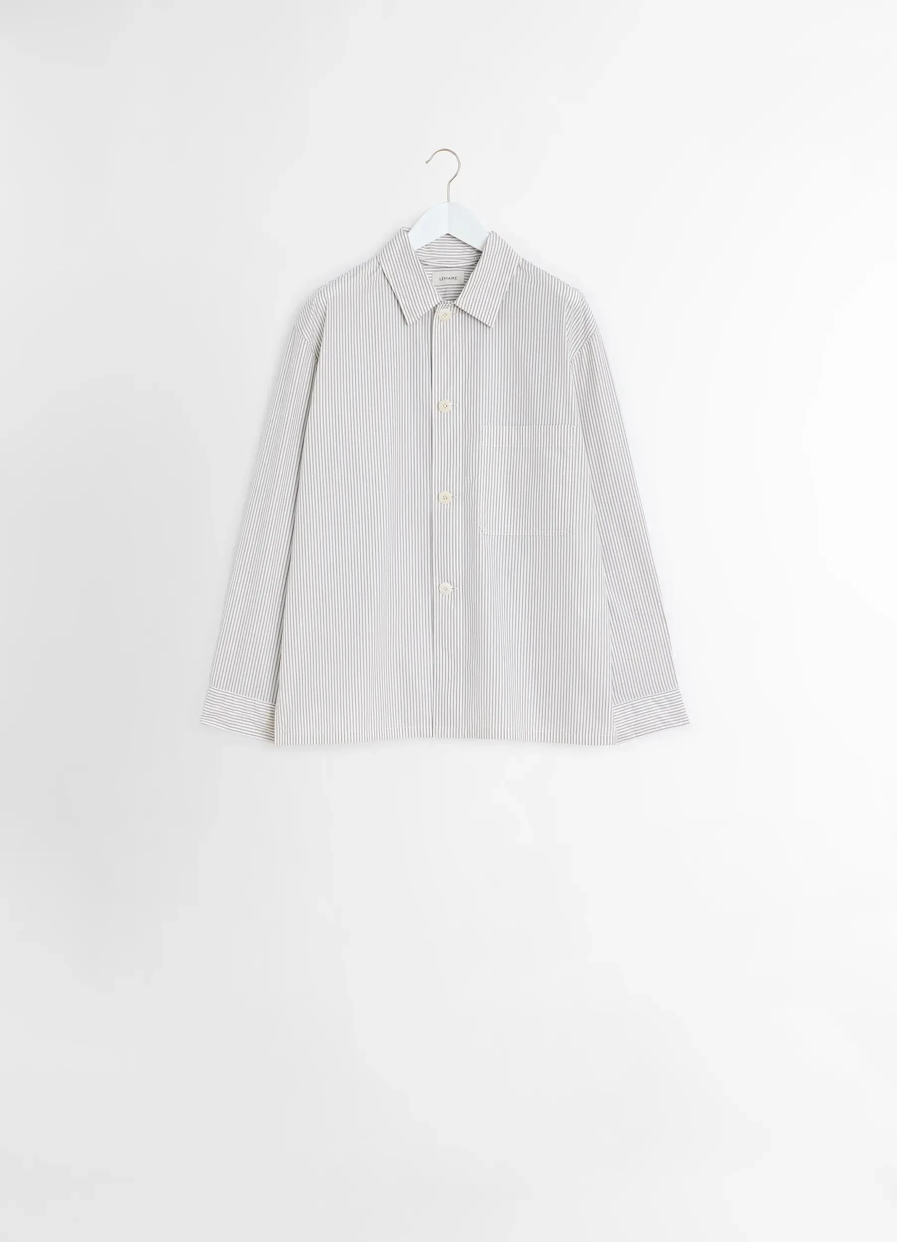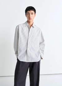 This unisex shirt epitomizes the "in & out" philosophy, a theme dear to LEMAIRE. This season, it is made in striped cotton poplin, a light and soft material bringing comfort to the garment. The Pyjama Shirt has a convertible collar which can be worn open at the brake for a more relaxed attitude. This boxy style features a wide centre-front placket with four big corozo buttons, as well as a patch pocket at the front and working cuffs. DETAILS - Boxy fit - Patch pocket - Corozo buttons Made in Tunisia Style: SH1177 LF1409 The Models are 177cm / 5'9½'' ft and 187cm / 6'1½'' ft and are wearing sizes 36 (S) and 48 (M). FABRICS & CARE Main Fabric: 100% Cotton Soft wash 30° Do not bleach Do not tumble dry Cool ironing Soft dry cleanM