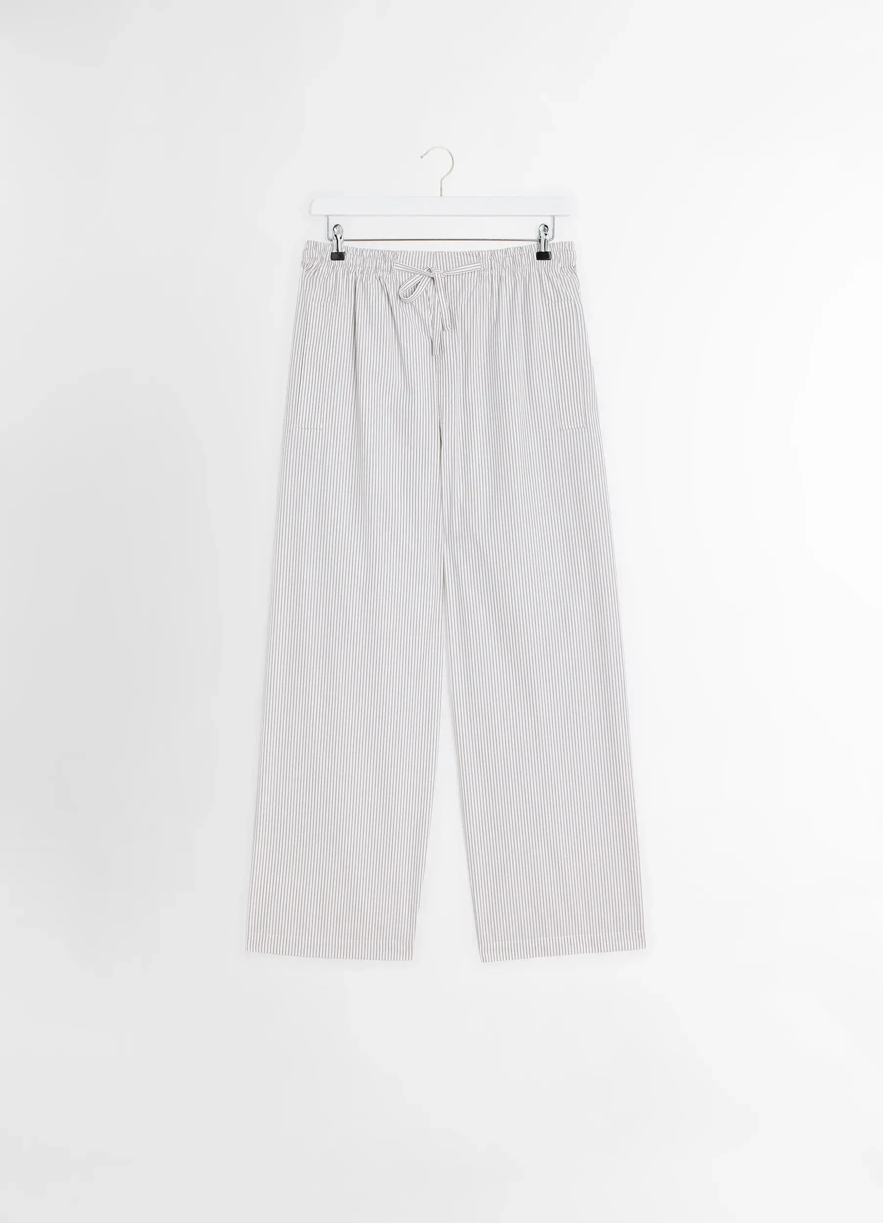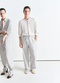 These unisex pants epitomize the "in & out" philosophy, a theme dear to LEMAIRE. They are crafted from striped cotton poplin, a light and soft material bringing comfort to the garment. Their pyjama-like fit is relaxed, achieved by multiple pleats below the elasticated waist which extend down the leg. Practical details include a a drawstring to tie the waist, a buttoned fly with topstitching details and side welt pockets. DETAILS Relaxed fit Mid-rise Elasticated waistband with interior drawstring Buttoned fly One back welt pocket Corozo buttons Made in Tunisia Style: PA1211 LF1409 The Models are 177cm / 5'9½'' ft and 188cm / 6'2'' ft and are wearing sizes 36 (S) and 48 (M). FABRICS & CARE Main Fabric: 100% Cotton Soft wash 30° Do not bleach Do not tumble dry Cool ironing Soft dry clean Discover the traceability
