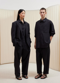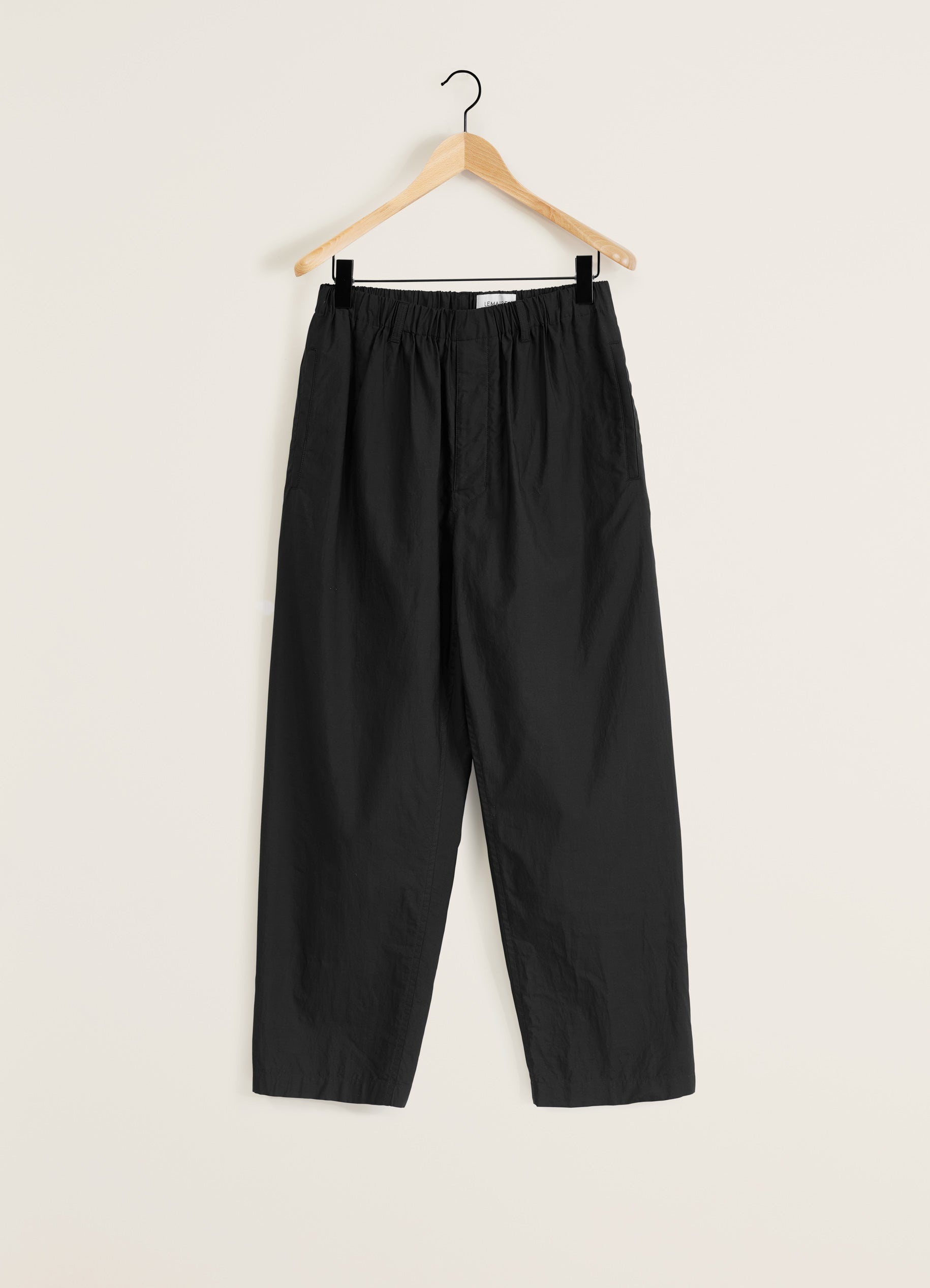 These unisex pants are a staple of LEMAIRE’s wardrobe. They are made of a cotton and silk blend that has been delicately washed, allowing a softer hand. The fabric enhances fluidity and lightness of the garment. Their pyjama-like fit is relaxed, achieved by multiple pleats below the elasticated waistband that extend down the leg. Practical details include a buttoned fly with angled stitching and side welt pockets. DETAILS - Relaxed fit - Corozo buttons - Buttoned fly - One back welt pocket Made in Slovakia Style: PA1047 LF1209 FABRICS & CARE Main Fabric: 80% Cotton / 20% Silk Main Lining: 100% Cotton Do not wash Do not bleach Do not tumble dry Cool ironing Soft dry clean