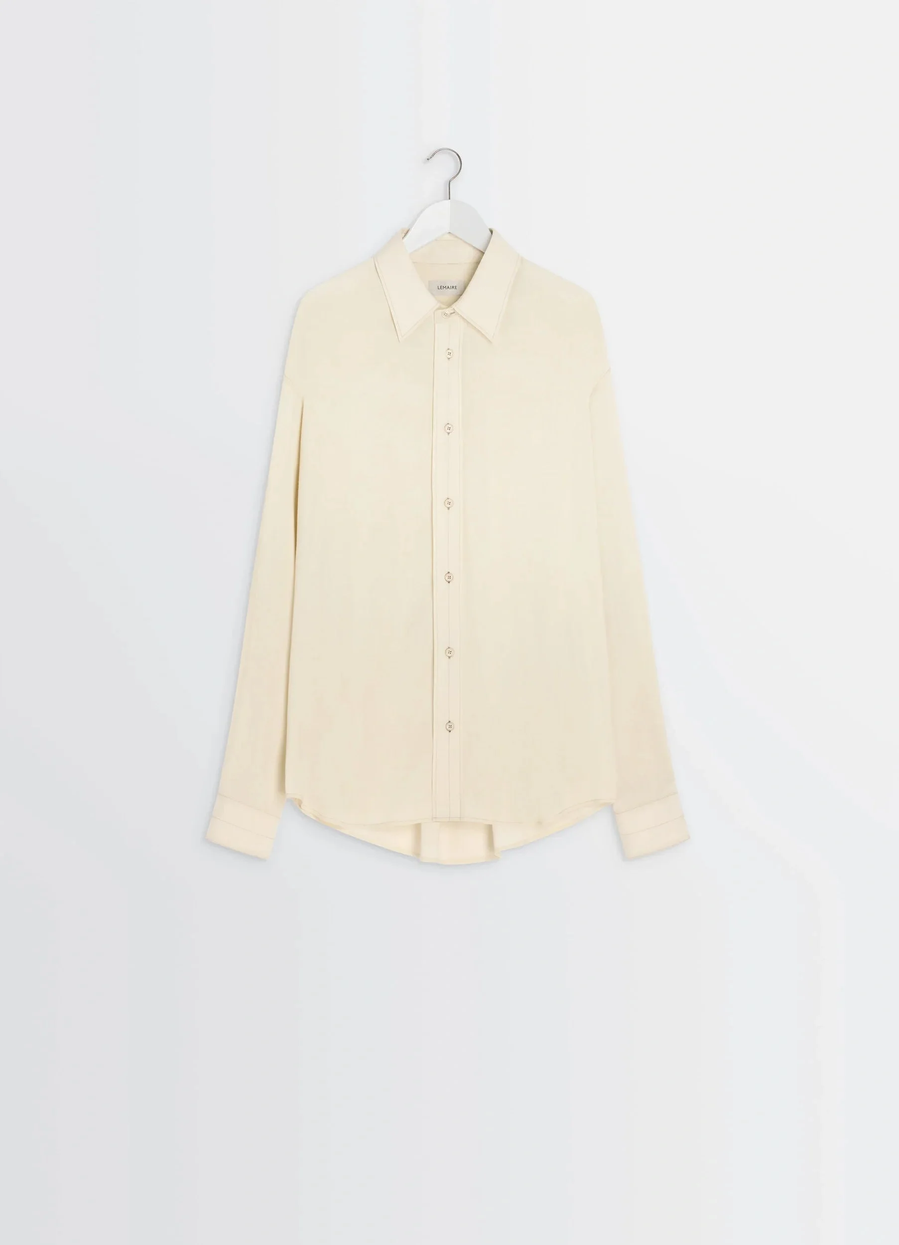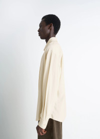 This fluid relaxed shirt is inspired by Lemaire's love for movement. It is crafted in a light viscose and wool blend with a smooth, compact hand. The model is 187 cm tall and is wearing a size 48 (M). This fluid relaxed shirt is inspired by Lemaire's love for movement. It is crafted in a light viscose and wool blend with a smooth, compact hand. The model is 187 cm tall and is wearing a size 48 (M). DETAILS Relaxed shirt in light viscose and wool blend Oversized cut Shirt collar Front button closure Long sleeves Straight buttoned cuffs Mother-of-pearl buttons Flat pleat at the back Contrast topstitching Made in Tunisia Style : SH1206 LF1286 The model is 187 cm tall and is wearing a size 48 (M). Relaxed shirt in light viscose and wool blend Oversized cut Shirt collar Front button closure Long sleeves Straight buttoned cuffs Mother-of-pearl buttons Flat pleat at the back Contrast topstitching Made in Tunisia Style : SH1206 LF1286 The model is 187 cm tall and is wearing a size 48 (M). CARE Main Material: 85% Viscose 15% Virgin Wool Soft wash 30° Do not bleach Do not tumble dry Cool ironing Soft dry clean Main Material: 85% Viscose 15% Virgin Wool Soft wash 30° Do not bleach Do not tumble dry Cool ironing Soft dry clean